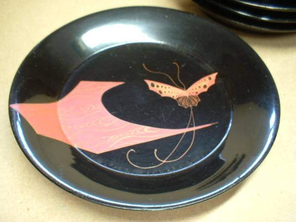 明治期頃の京塗り蝶図・菓子皿(5客)です。大変モダンな図柄です。時代のすれ等多少ありますが状態は良いです。口径12.5×底8×高2センチです。