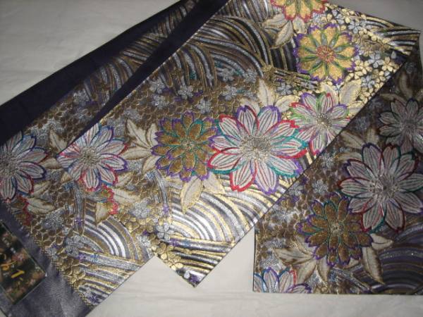 京都西陣 じゅらく の 若向きよう(振袖、訪問着、付け下げ、無地、小紋、など向き)のTOPブランド品『花かるた(花かおり)』ブランドです。6通柄袋帯 新品未仕立て品、絹100%金属糸等使用 (西陣証紙) 暗め紫色のぎんの生地に はななみ、、 (裏地くらめ紫)