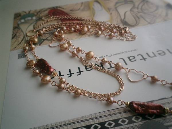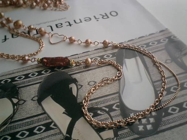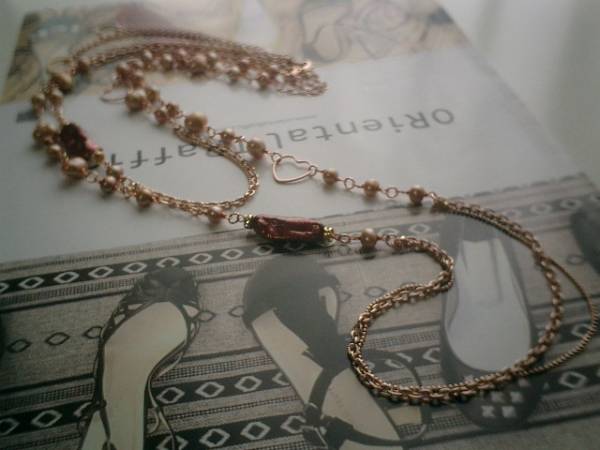 パール物語・・シリーズです♪深い赤とアンティークピンクの淡水パールのネックレス2本セットです♪同じデザインの長さ違いです♪色々な組み合わせで楽しんでいただけます♪シックなブロンズピンクの淡水パールはアンティークな雰囲気です♪♪6ミリ位のポテトと9ミリ位のバロックのデザイン違い、大きさ違いです♪アクセントのサテンボルドー色の淡水パールは10×25ミリ位です♪ジルコニアのロンデムやハートのチャームをデザイン違いのピンクゴールドのチェーンでつないでさりげなくロマンチックしています♪長い方のネックレスは全長102センチ位で調節自由です♪2連にされても素敵です♪短い方は全長65センチ位で調節自由です♪チョーカー風にしたりブレスにしても可愛いです♪それぞれ単品でも出品しています♪お揃いのブレスレットやピアスも出品しています♪シンプルで飽きのこないいつまでも着けられるデザインを考えて作りました!ハンドメイドをご理解頂いてノークレーム、ノーリターンでお願いします
