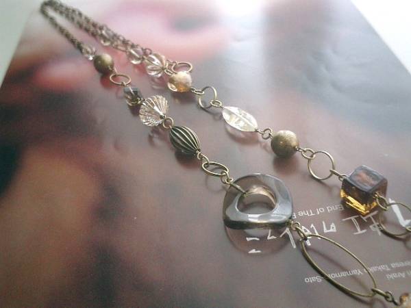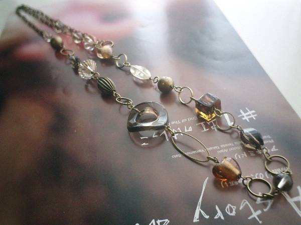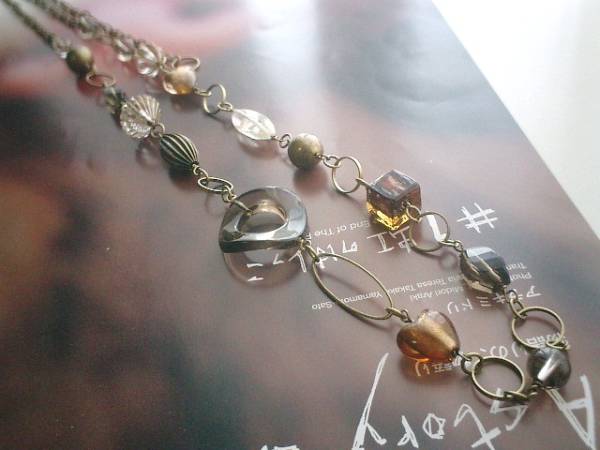 ローマに旅して・・シリーズです♪繊細で可憐な石を集めたネックレスです♪スモークークォーツの淡いブラウンとベネチアビーズの琥珀色が秋のロマンチックな表情です♪8ミリの丸玉、14×10ミリのスクエアナツメ、25ミリのリングなどデザイン違いのスモーキークォーツや12ミリのハートのベネチアビーズ、20ミリ×10ミリのナツメのシトリン、10ミリのキューブのベネチアビーズ、デザインメタルなどを集めたネックレスは全長80センチ位で調節自由です♪2連にされても素敵です♪♪お揃いのネックレスやブレスレットも出品しています♪シンプルで飽きのこないいつまでも着けられるデザインを考えて作りました!ハンドメイドをご理解頂いてノークレーム、ノーリターンでお願いします