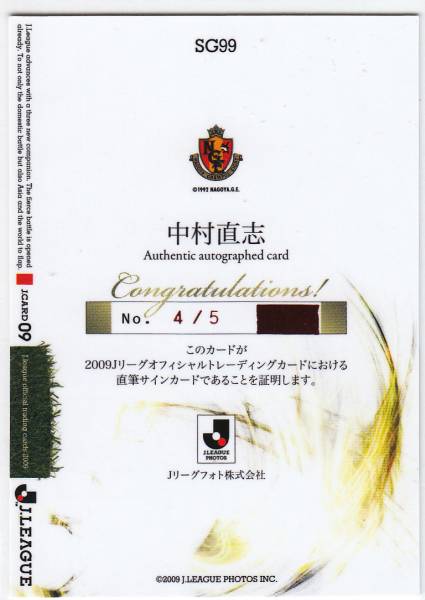 Jカード2009 5枚限定直筆サインカード SG99 中村直志(名古屋)