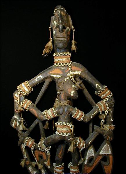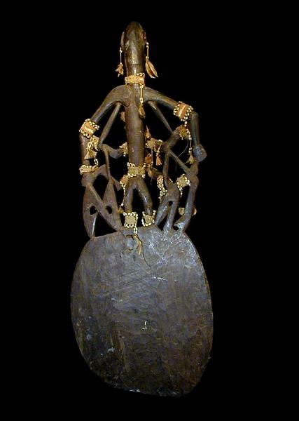 “アスマット”とは、「我々は木だ」、「真実の人間」を意味します。古くから伝わる「フメリピッツ神話」によれば、アスマット人は木から生まれてきたとされています。そのため、亡くなると、身内の手によって木に彫り込まれるのです。木から生まれて木に還る、というサイクルなのですね。このパネル彫刻に刻まれた人々も、その意味では現世から見るとすべて故人です。しかし木の中で“生き返った”と見るべきでしょう。ここに紹介するパネル彫刻は、1997年10月に行われた「アスマット芸術祭」の国際オークションで入手したものです。