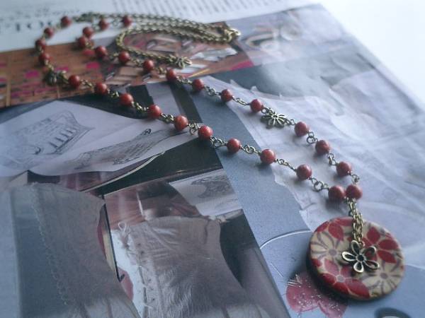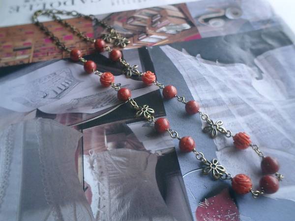 秋色コレクション・・シリーズです♪赤い小花柄の・・深い赤のネックレス2本セットです♪重ねてネックレスに1本をブレスレットにといろいろに楽しんでいただけます♪長い方のネックレスは6ミリの丸玉のスポンジ珊瑚にトップは30ミリ位のシックな赤の小花柄の椰子のボタンです♪♪お花のチャームを合わせてアンティークモダンな表情です♪長さは全長75センチ位で調節自由です♪短い方のネックレスは8ミリの丸玉のスポンジ珊瑚に8ミリの薔薇のスポンジ珊瑚やお花のチャームを合わせて可憐な表情です♪♪長さは全長56センチ位で調節できます♪チョーカー風にされたりブレスにされても素敵です♪それぞれ単品やお揃いのブレスレットやピアスも出品しています♪シンプルで飽きのこないいつまでも着けられるデザインを考えて作りました!ハンドメイドをご理解頂いてノークレーム、ノーリターンでお願いします