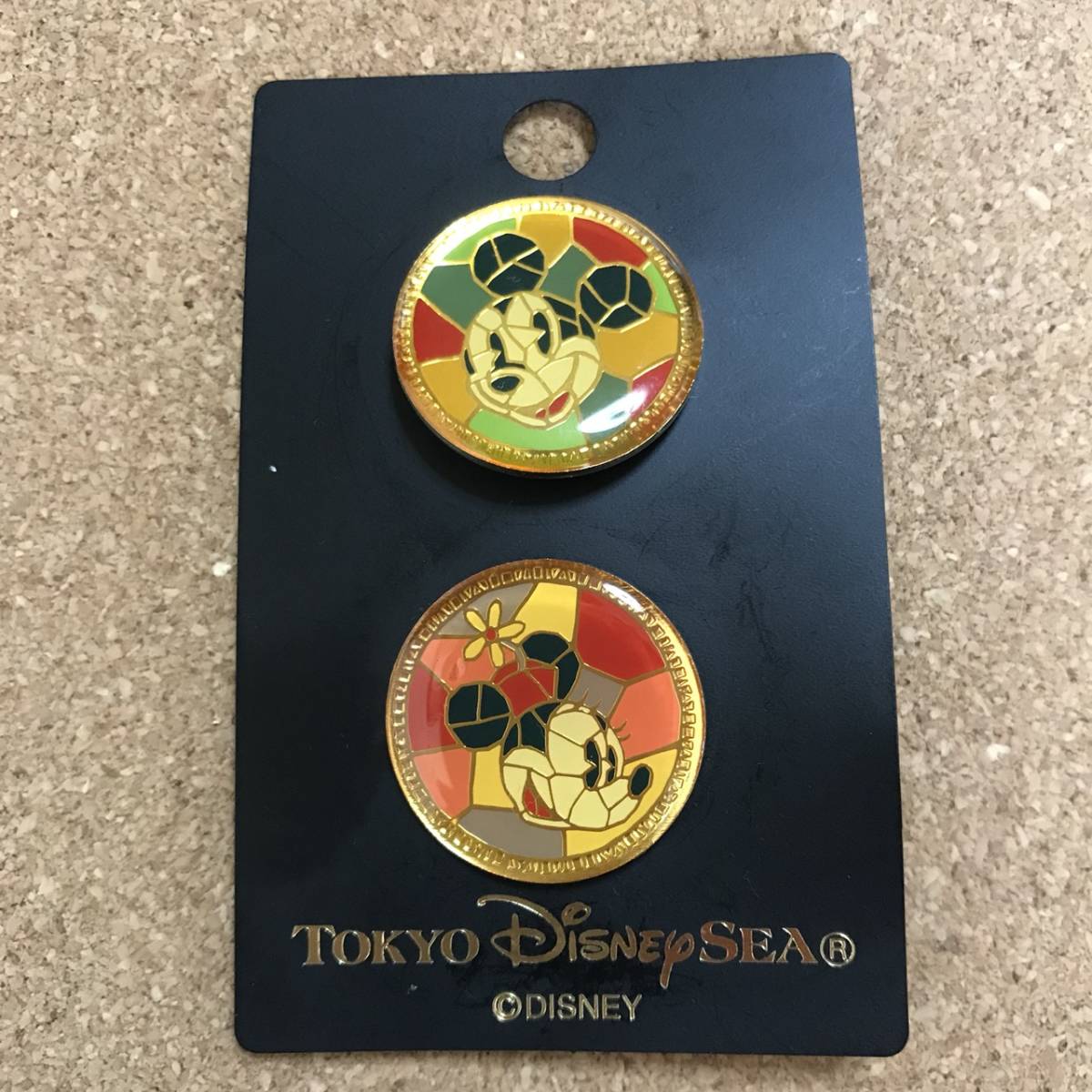 ミッキーマウス&ミニーマウスがセットになったステンドグラス風のモザイク柄ピンバッジです。