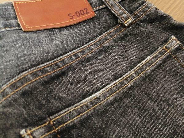 ポケット口に少し擦り切れのある黒のジーンズです。