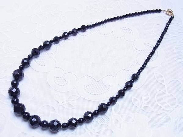 【数量限定販売になります】 センターに約12mmのサイズを使った、グラデーション・ネックレスです。 カットされた玉は、キラキラ反射して綺麗です。 使用石 : 天然ブラック・カルセドニー (処理石) 通称:ブラック・オニキス 長さ : 約50cm 幅 : 約4~12mm 留め金 : ホック式 地金 : ブラス メッキ : ゴールド・コーティング 参考小売価格 : 6000円 鑑別機関の最高峰 「中央宝石研究所」 で鑑別をして、間違いない商品を供給してくれる、信用できるサプライヤーから仕入れをしています。 【備考】 誠に勝手ながら、土、日曜日、祝日、長期休暇は、 発送業務をお休みさせていただいておりますので、ご了承下さい。 画像はサンプル画像ですが、サンプル画像と遜色のない商品をお送りします。 出来るだけ実物に近い画像を使っておりますが、実物と多少色が異なる場合がありますので、ご了承下さい。 環境に配慮して、必要以上の梱包をしておりませんのでご理解下さい。 基本的にはチャック袋等に商品を入れ、緩衝材で壊れないように保護してお送り致します。 プレゼント梱包はご対応しておりませんので、ご了承下さい。 スムーズなお取り引きを心掛けておりますが、仕事の都合上、ご返信、発送等に 多少お時間を頂く場合もあるかと思いますが、ご理解の程、よろしくお願いします。 ノークレーム、ノーリターンでお願い致します。 | |||