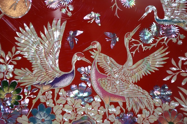 本体全体に仲睦まじい鶴の群れの螺鈿細工が描かれた、豪華で素晴らしい宝石箱です。