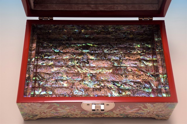 内部にもとてもカラフルな螺鈿細工で仕上げられた素晴らしい商品です。