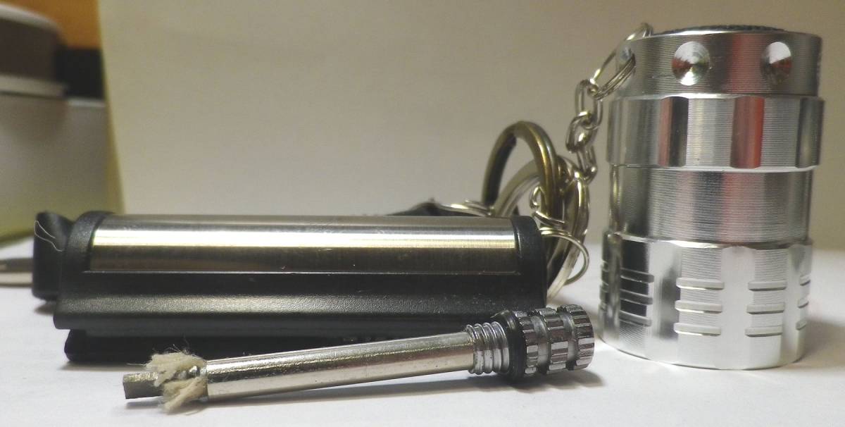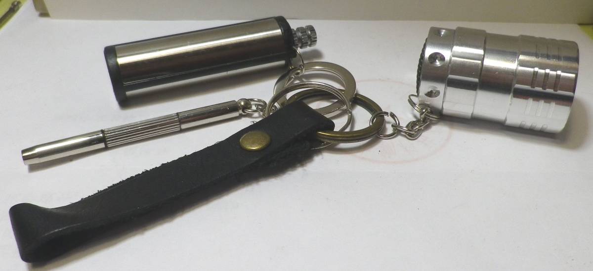 商品コメント | メーカー『刻印はありません』の珍しいマッチライターです。未使用新品です。ナチュラル加工のオイルレザーの牛革ストラップとアルミ製の高輝度9LEDライト(電池はCR2025/3vを2個使用します**テスト用としまして2個付属します。)とミニドライバ(両先端のキャップを回して外すと+と-が付いています)のでいざという時に役立つと思います。オイルマッチは円型ロングタイプです。使用はオイルを芯に染み込ませて、サイドの火打石で着火させますので、フリント(石)は要りません。着火棒にゴムパッキンもあり、水中に入れても大丈夫?!凄くタフ!オイルの保持性も大変に良好です!鍵やバックに取り付けられます。一個持っていると重宝します!、ノークレーム、ノーリターンでお願いします。貴方のコレクションにどうぞ! 落札価格に送料がかかります。**LEDライトは同じモデルの色違いがありますが、商品はシルバー単色です! |