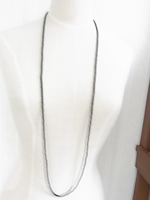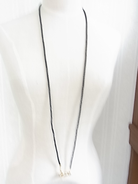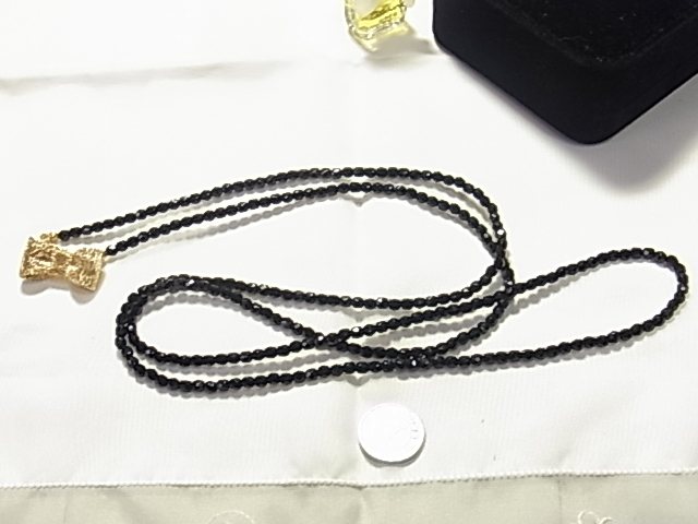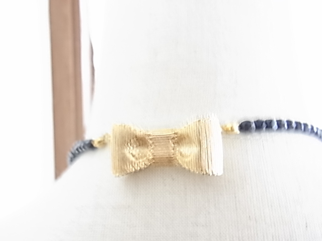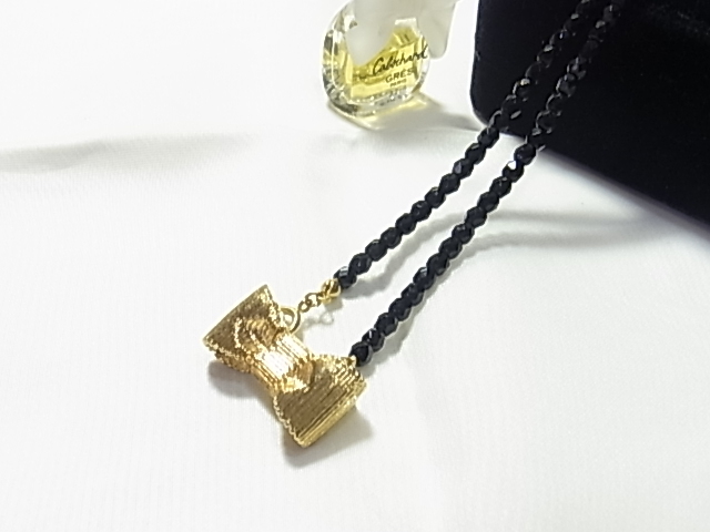 ☆カッティングが美しい黒 ブラックのビーズビジューにゴールドカラーのリボンがアクセント 大人可愛い ロングネックレス
