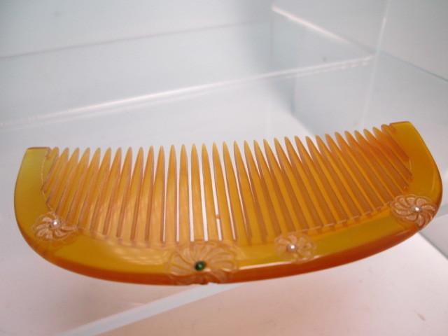 【江月】アンティーク・本鼈甲 本翡翠/ベビーパール飾りの花紋の櫛 共ケース付