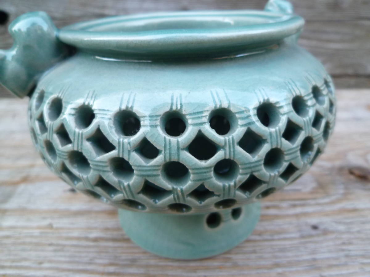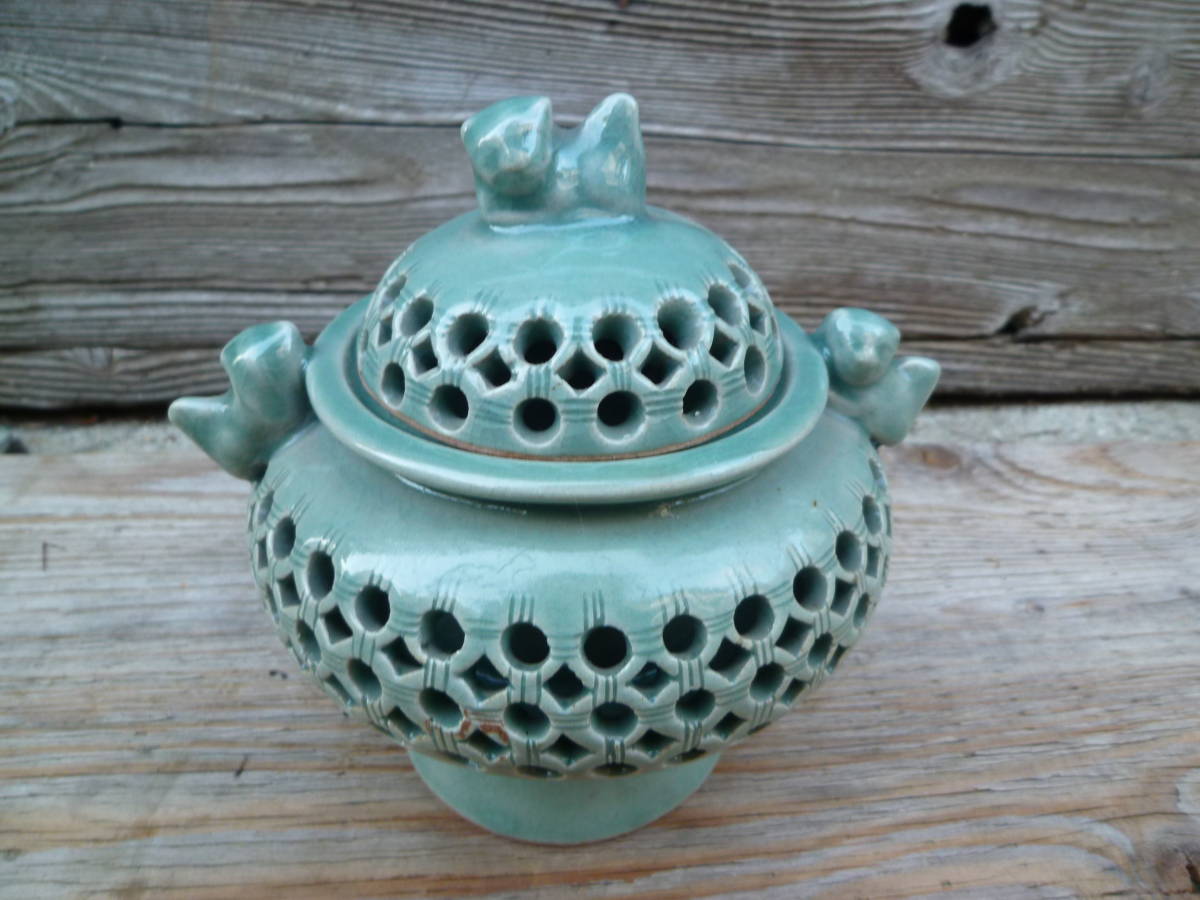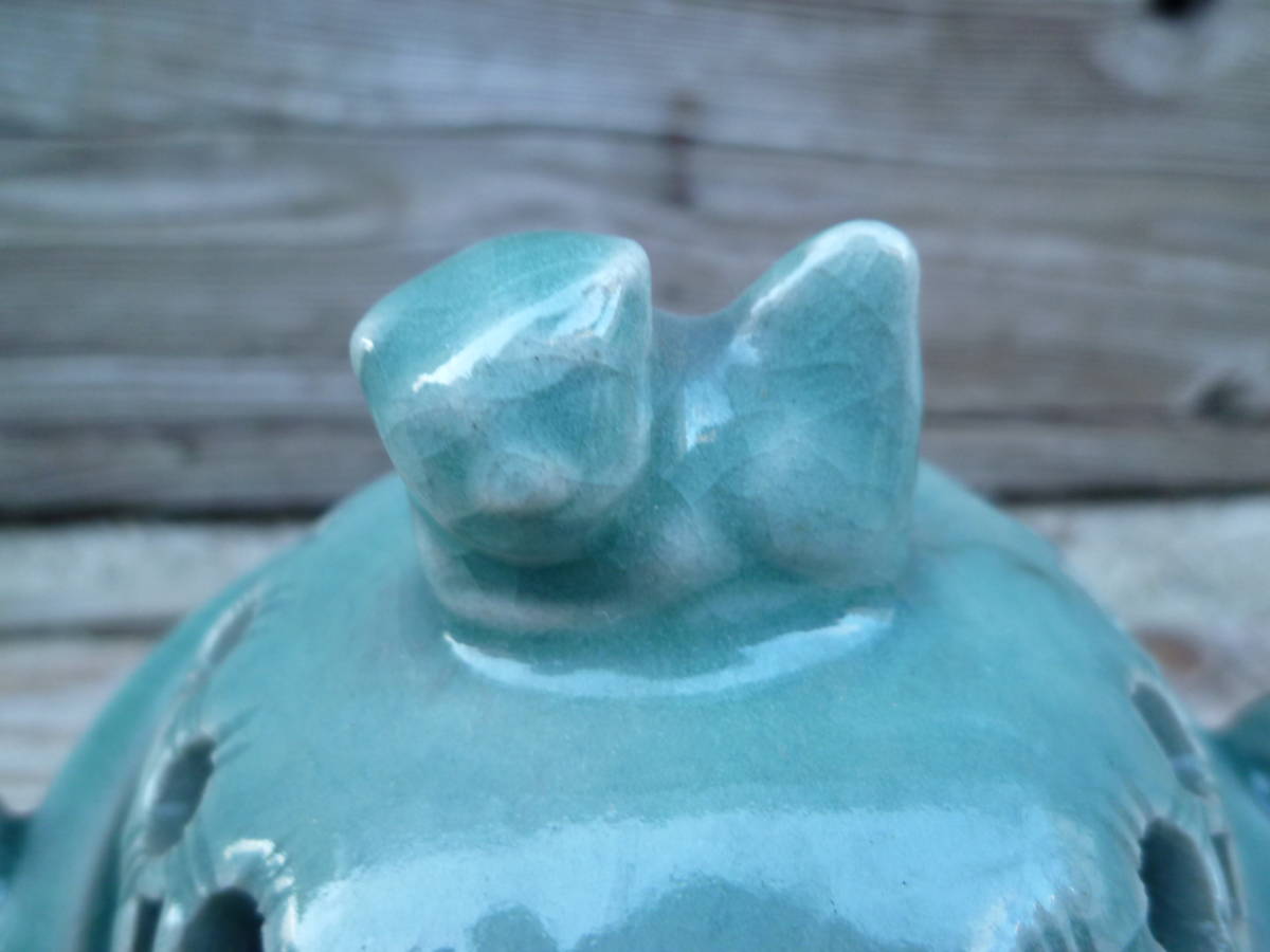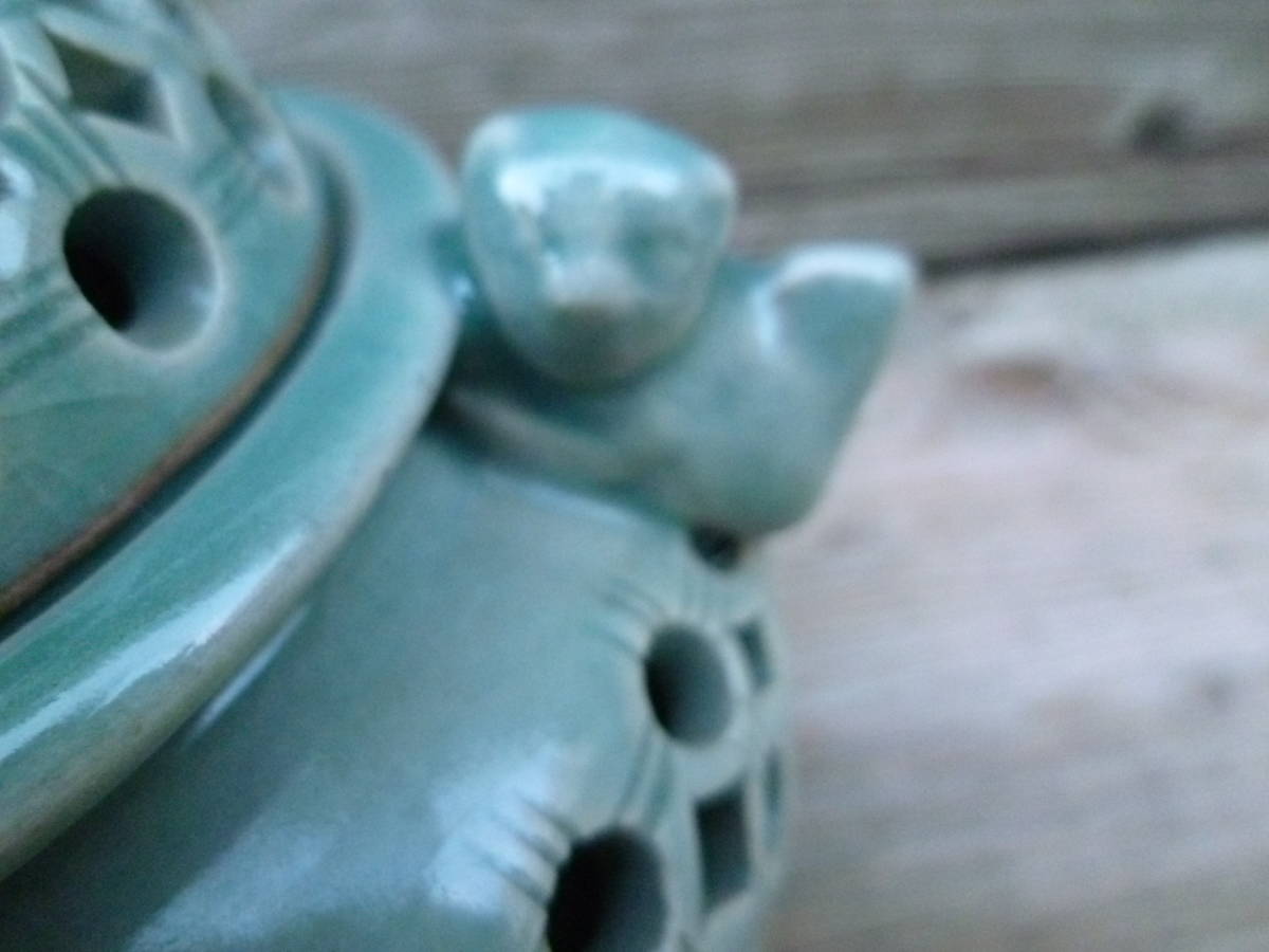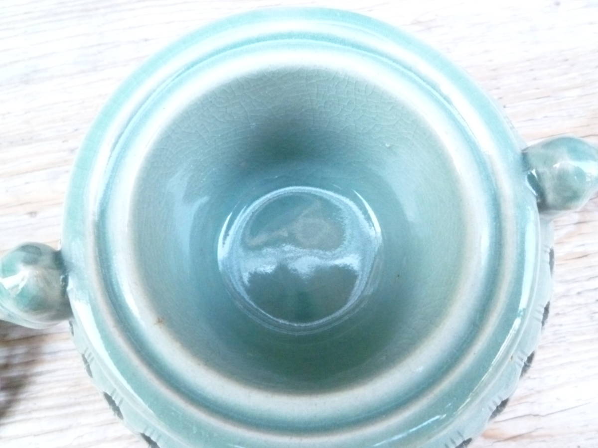 こちらは青磁の香炉となります。在銘で底面に「志松」とあります。猫or狛犬と思われる動物が3匹にいます。セカンドハンド品につき、傷、汚れなどございます。ご了承の上でご入札下さいませ。