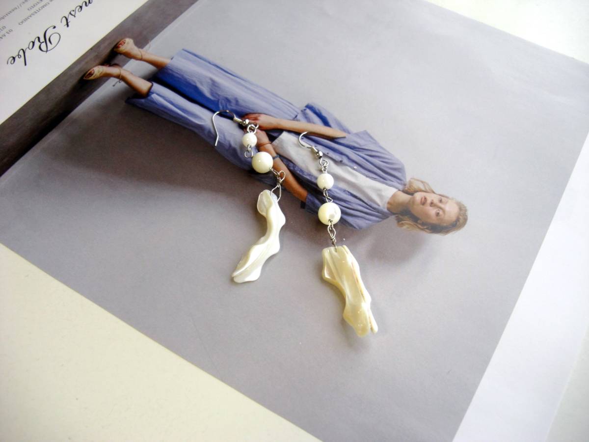 夏色・見本帖・・シリーズです♪シェルの存在感・・やさしいオフホワイトのシェルビーズのピアスです♪丸玉と不揃いのシェルを合わせて個性的な表情で す♪6ミリ、8ミリの丸玉に長さ3・6センチ位の不揃いシェルを合わせました♪長さは全長9・7センチ位です♪イヤリングに変更出来ます♪お揃いのネックレスも出品しています♪シンプルで長く着けていただけるデザインを考えて作りました♪ ハンドメイドをご理解頂いてノークレーム、ノーリターンでお願いします