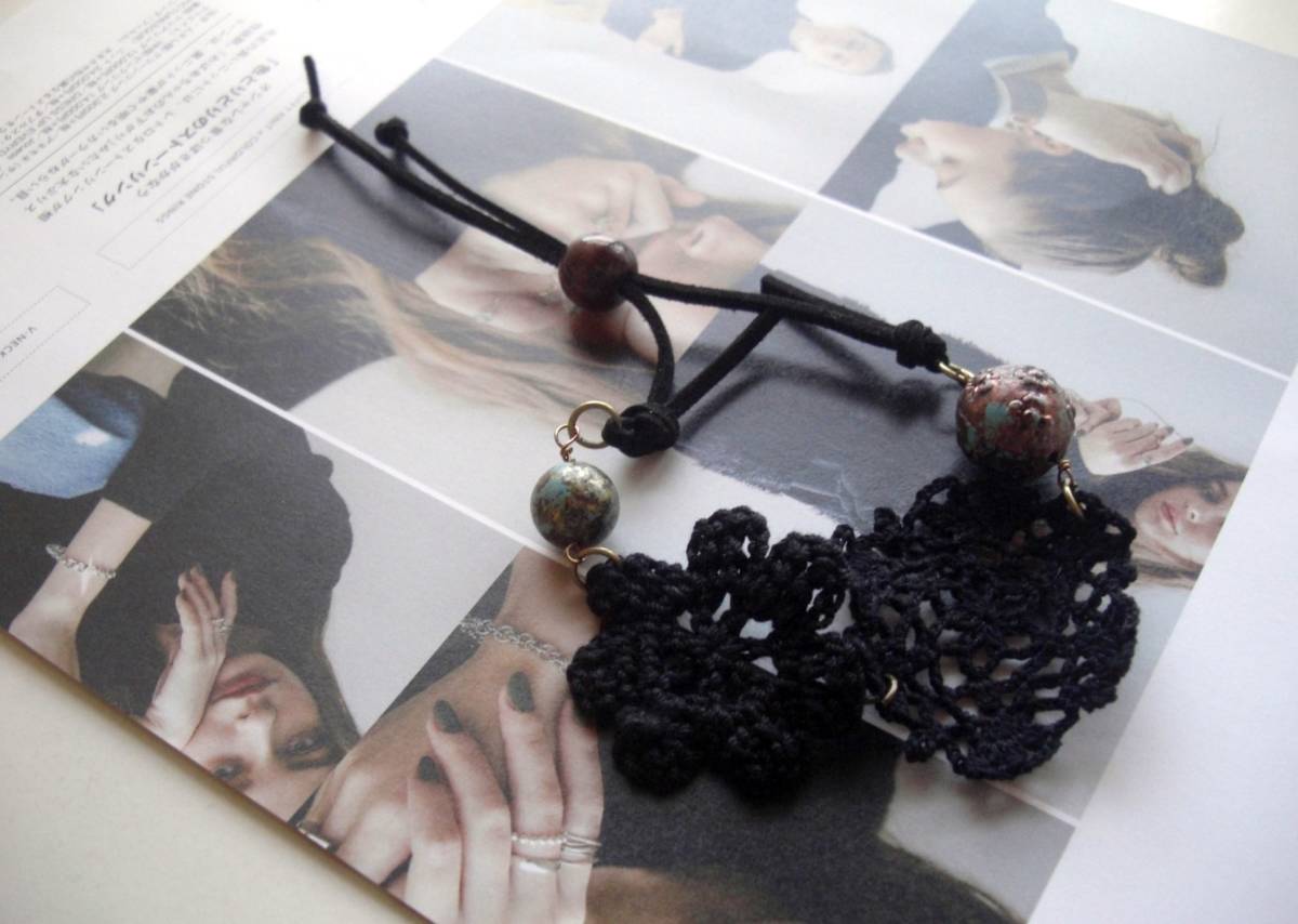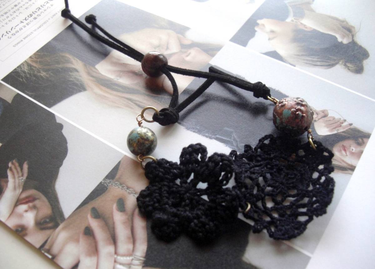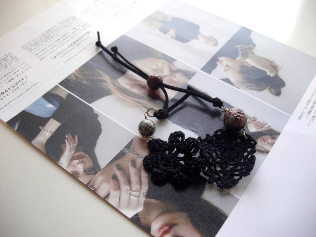 初夏の色を+して・・シリーズです♪パンクと黒レース・・パンクっぽい樹脂ビーズとシックな黒レースを合わせたブレスレットです♪メタリックな柄の樹脂ビー ズは10ミリと15ミリの大きさ違い、黒の綿レースは35ミリから45ミリ位です♪黒なので甘すぎないロマンチックな表情です♪長さは全長35セン チ位でスェード紐で調節出来ます♪お揃いのネックレスも出品しています♪いつまでも着けられるデザイ ンを考えて作りました♪ハンドメイドをご理解頂いてノーク レーム、ノーリターンでお願いします
