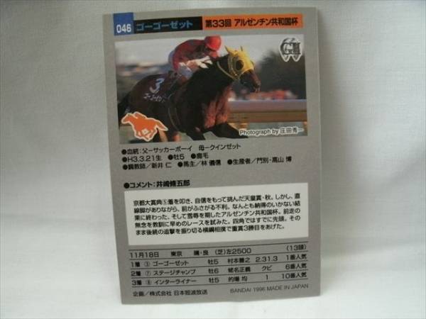 | ☆☆☆商品説明☆☆☆ 【メーカー】 バンダイ 【シリーズ】 95年サラブレッドカード 【番号】 046 ゴーゴーゼット 【種類】 GⅡカード 【数量】 1枚 サラブレッドカードの第1弾95年度のカードになります。 |