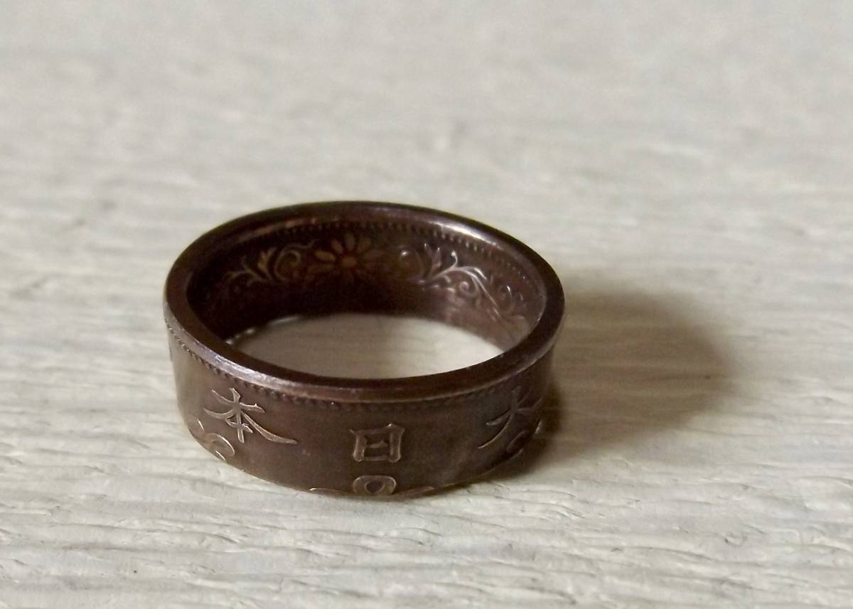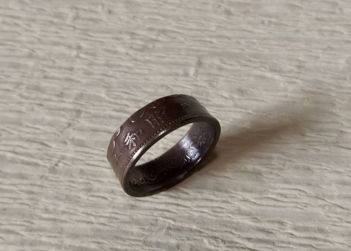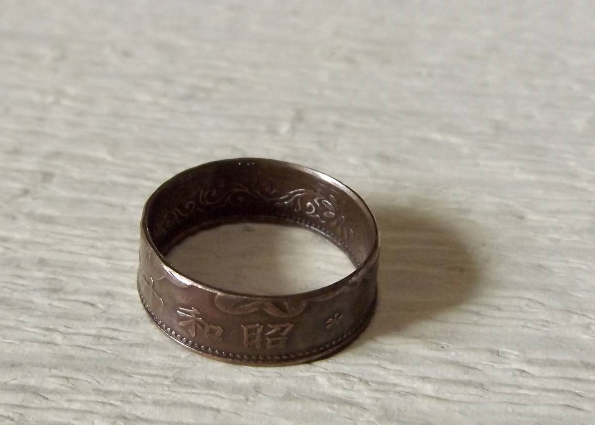 この商品は、昭和11年発行の桐1銭青銅貨を使用。銅貨に穴を明け木槌で叩いてコインリングに成形した1点ものです。