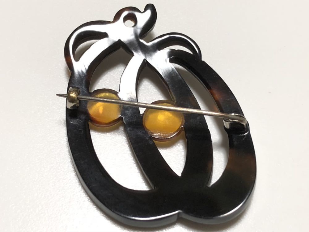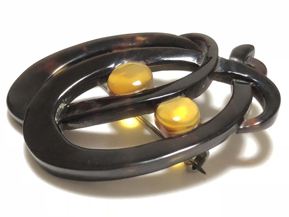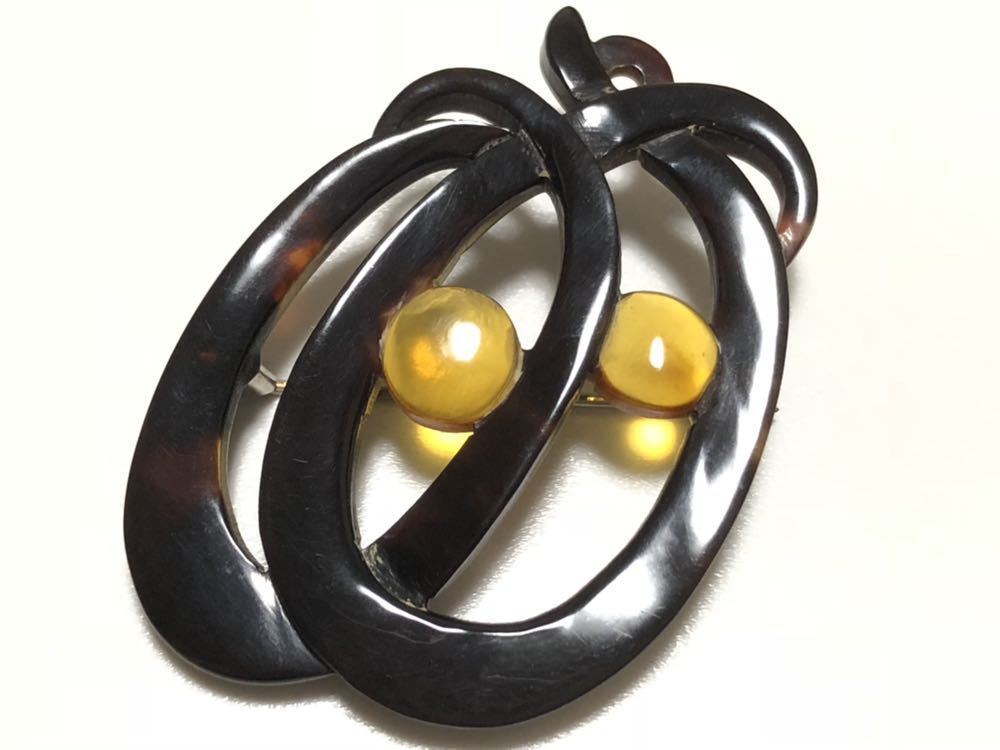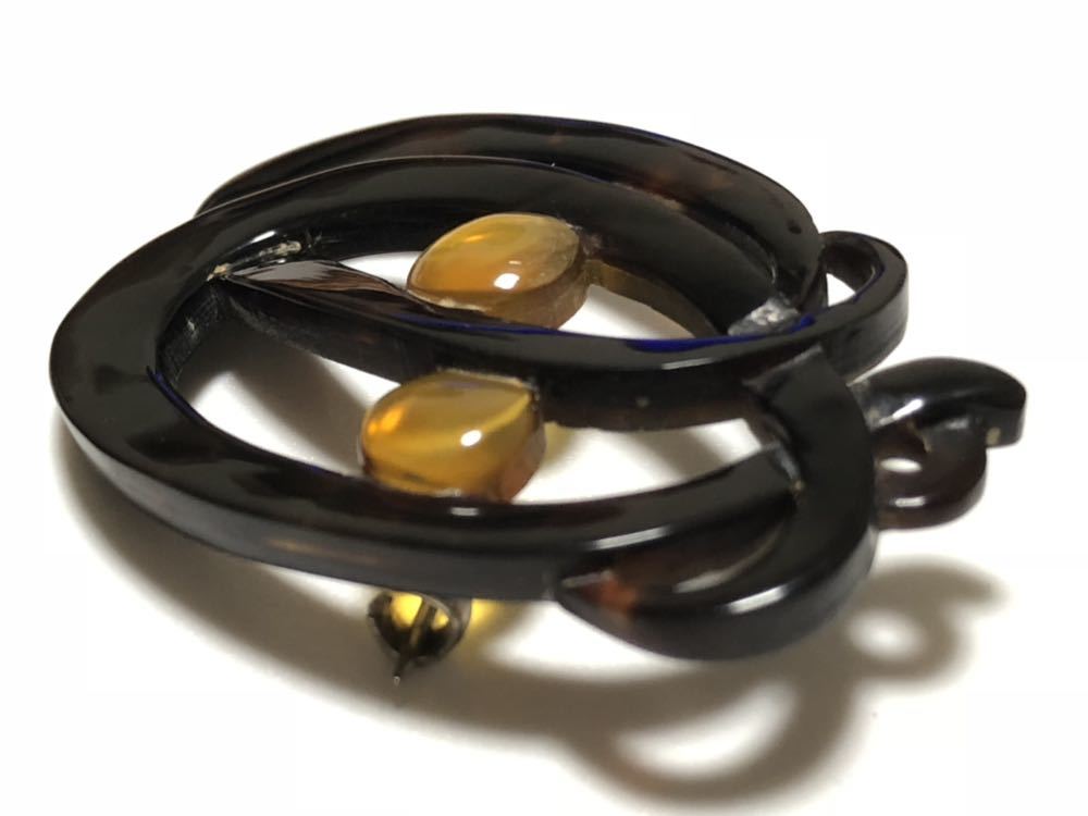 白甲、黒甲の本鼈甲を使用し、透かし細工を施した、デザインブローチです。鼈甲部分に欠けや虫食いはありません。