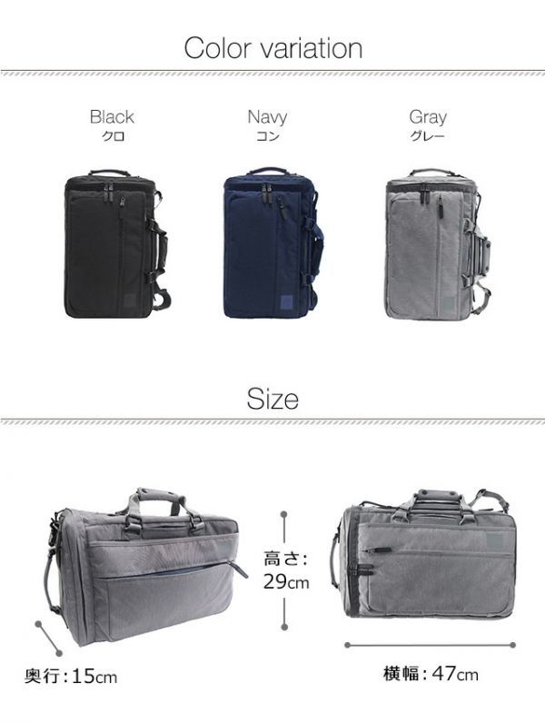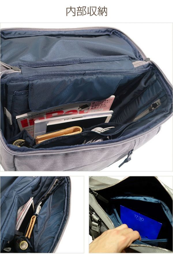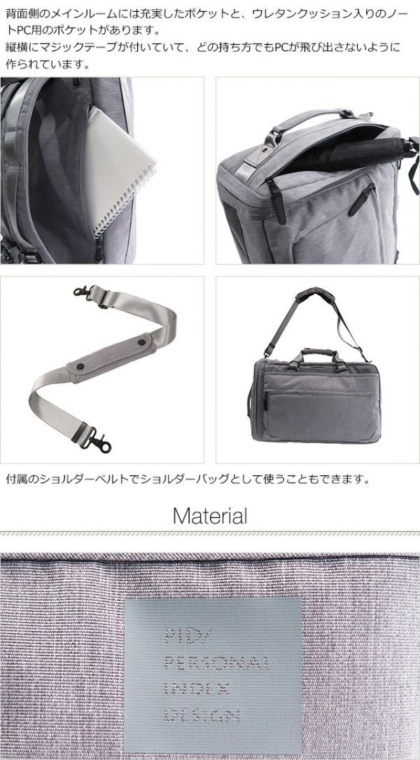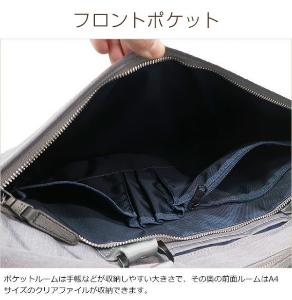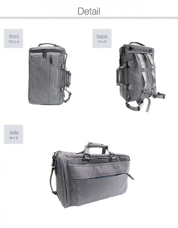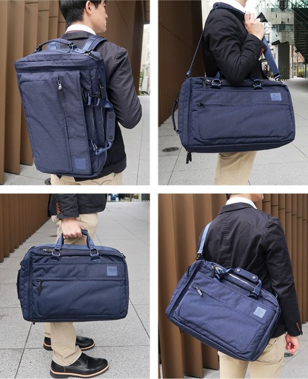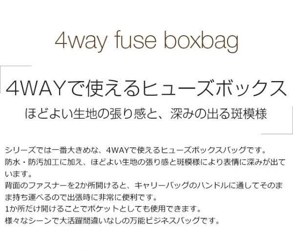 【機能説明】リュックやショルダー掛けもできるヒューズボックス型のビジネスバッグ シリーズでは一番大きめな、3WAYで使えるヒューズボックスバッグです。 防水・防汚加工に加え、ほどよい生地の張り感と斑模様により表情に深みが出ています。 横持ちと縦持ち・リュック・ショルダー掛けで使えます。 横持ち、縦持ちはそれぞれのハンドル、 リュックは背面ファスナーに収納されているリュックショルダーを取り出し下部のポケットにあるDカンに繋げるとリュックになります。 付属のショルダーベルトでショルダーバッグとして使うこともできます。 内部は2層構造で、メインルームと前面ルームがあります。 メインルームへのアクセスファスナーが上部と左部にあり、縦にして背負う時にはヒューズボックスリュックとして使うことができます。 ポケットルームは手帳などが収納しやすい大きさで、その奥の前面ルームはA4サイズのクリアファイルが収納できます。 背面側のメインルームには充実したポケットと、ウレタンクッション入りのノートPC用のポケットがあります。 縦横にマジックテープが付いていて、どの持ち方でもPCが飛び出さないように作られています。 背面のファスナーを2か所開けると、キャリーバッグのハンドルに通してそのまま持ち運べるので出張時に非常に便利です。 1か所だけ開けることでポケットとしても使用できます。 様々なシーンで大活躍間違いなしの万能ビジネスバッグです。