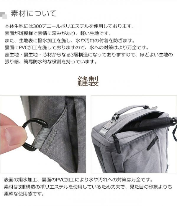 【material】本体生地には300デニールポリエステルを使用しています。表面が班模様で表情に深みがあり、軽い生地です。 また、生地表に撥水加工を施し、水や汚れの付着を防ぎます。裏面にPVC加工を施しておりますので、水への対策はより万全です。 表生地・裏生地・芯材からなる3層構造になっておりますので、ほどよい生地の張り感、簡易防水的な役割を持っています。