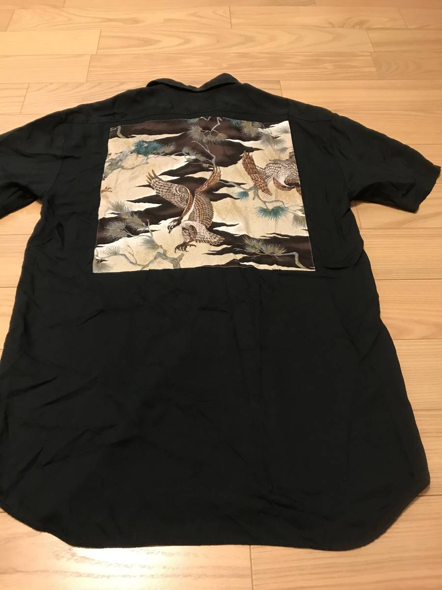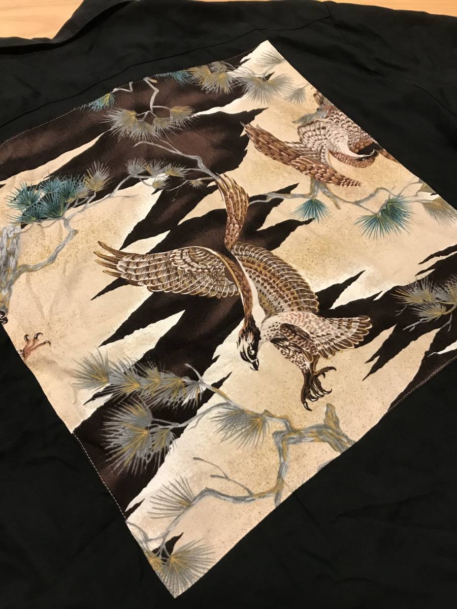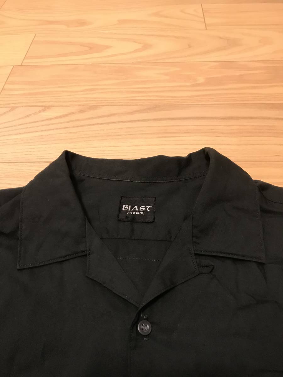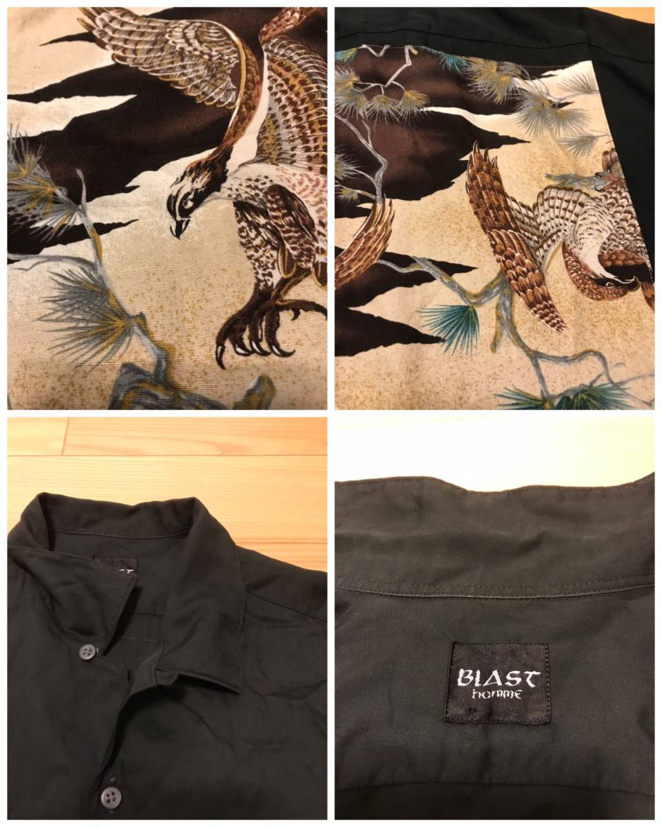 当時物 昭和 BLAST homme 背面バックスカジャン和柄 サイズF/L~並 レーヨン 半袖 開襟 オープンシャツ 黒 ロカビリー アロハ ボーリング