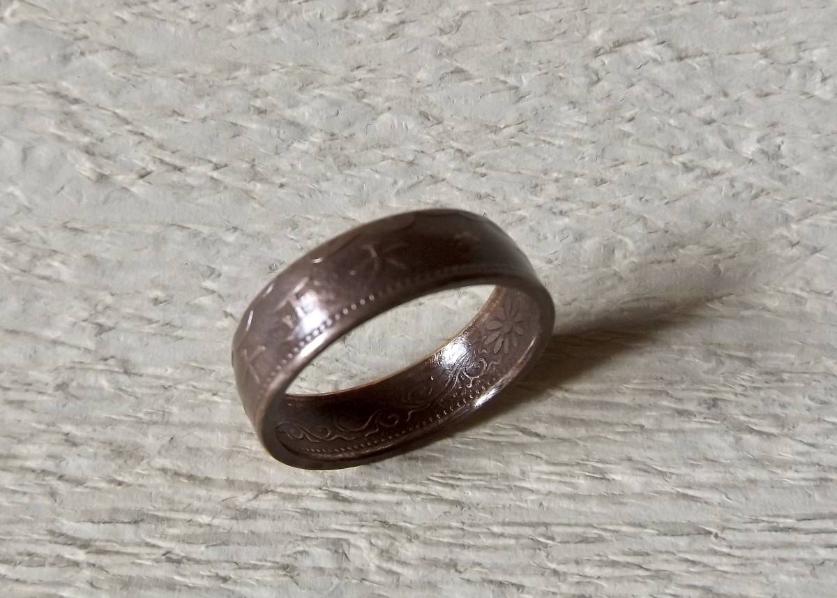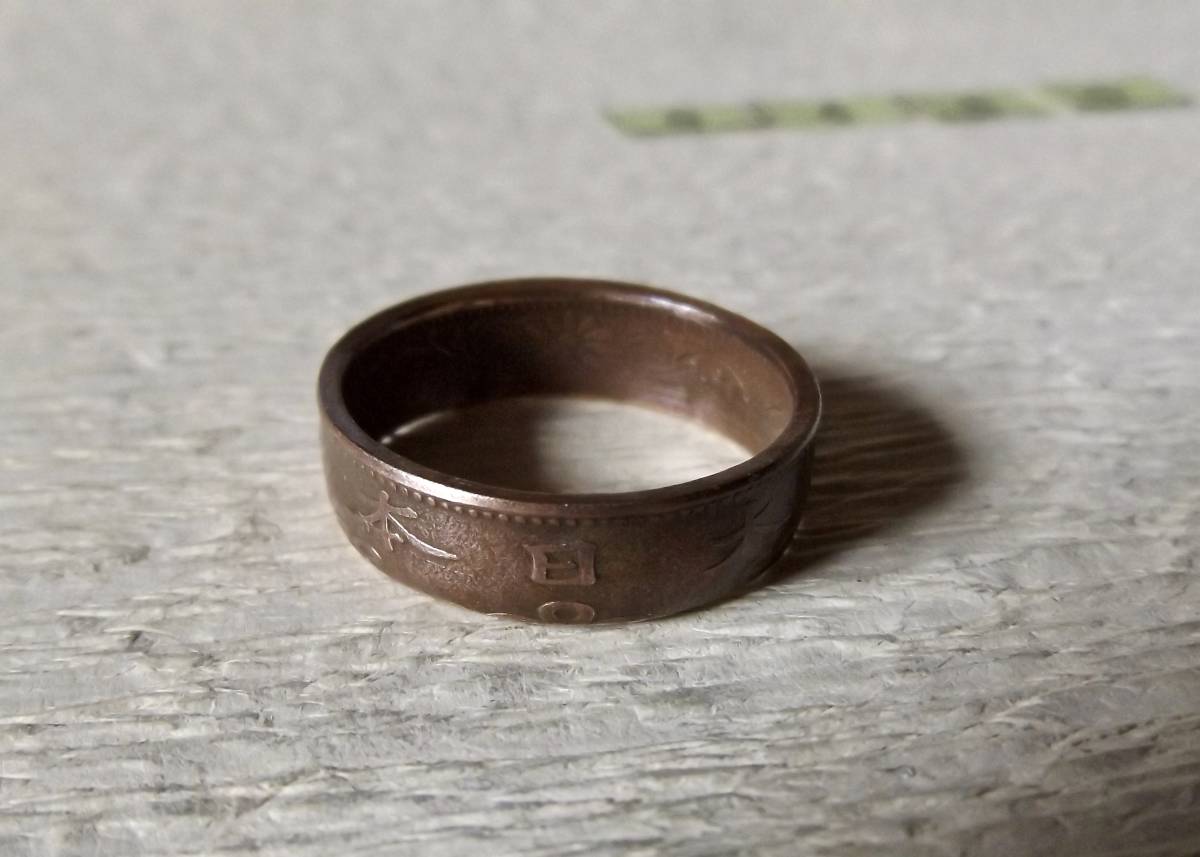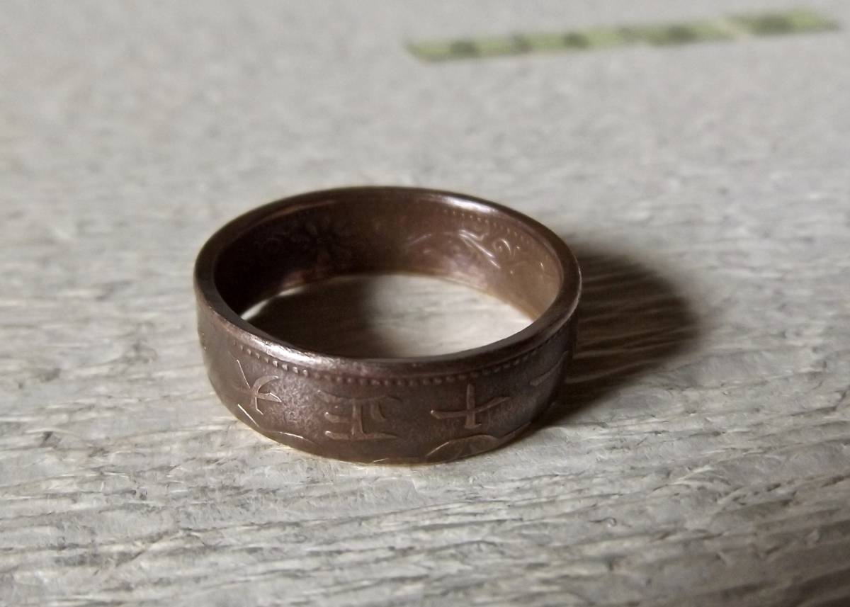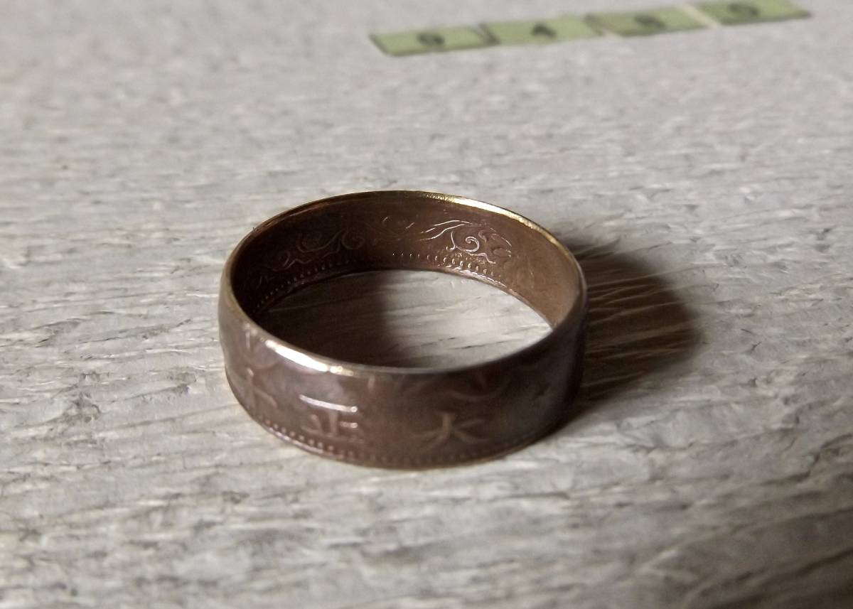 この商品は、大正11年発行の桐1銭青銅貨を使用。銅貨に穴を明け木槌で叩いてコインリングに成形した1点ものです。