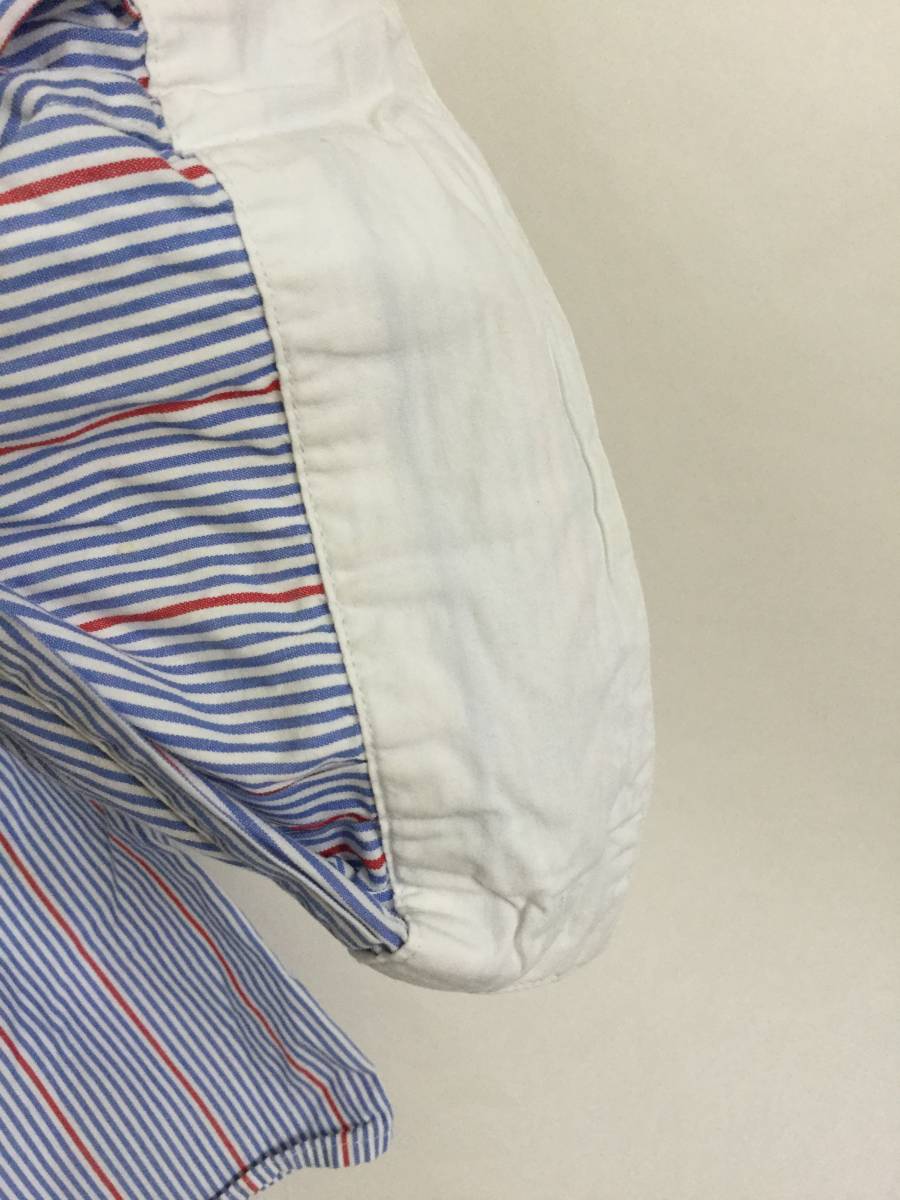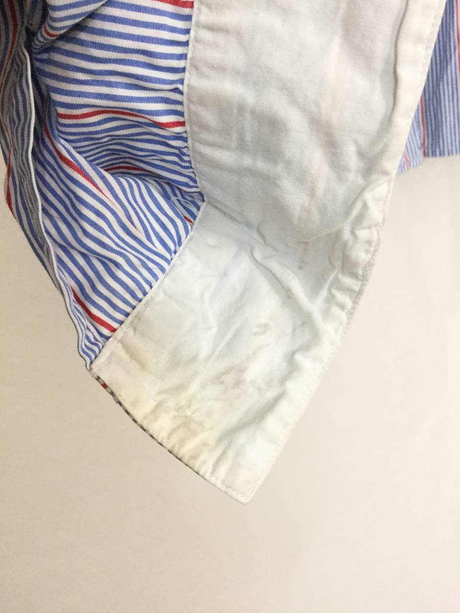 襟元に薄汚れがあり、袖口裏には黒っぽいシミや薄汚れが見られ使用感があります。