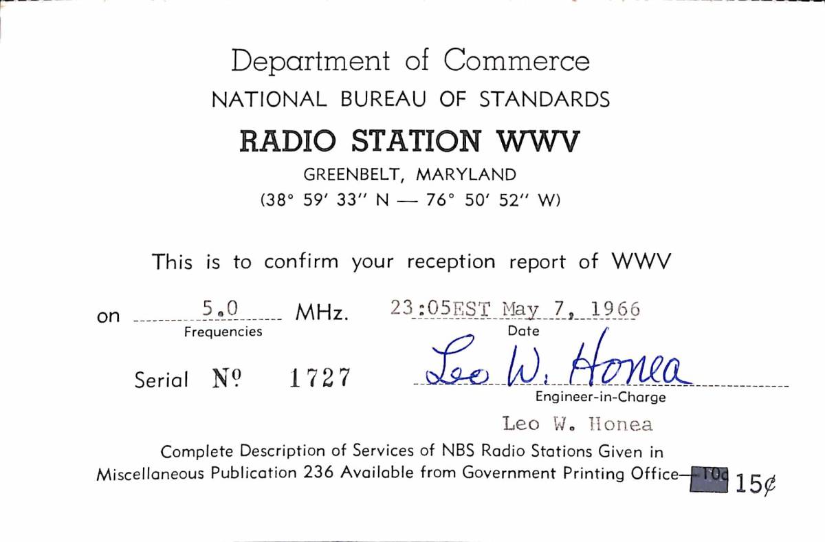 | 【商品名】・・・WWV(★アメリカ標準周波数報時局)のベリカード+三ツ折フォルダー付。 【コメント】・・・ハワイ州カウアイ島にあるWWVHも有名ですね! 【国名・地名】・・・・アメリカ合衆国★メリーランド州グリーンベルト。 【受信データ】・・・1966年5月7日・SW5MHZを受信。 【記載事項】・・・受信データのみ記載。 【状態】・・・シワ、汚れ、シミ、焼け、色あせ等があります。 ■カードの状態は★画像を参考に判断して下さい。 ■当方、1枚のみ所有していますので即決で落札者様のコレクションになります! ■この機会にぜひこのベリカードを貴方のBCLコレクションに加えて下さい! | |