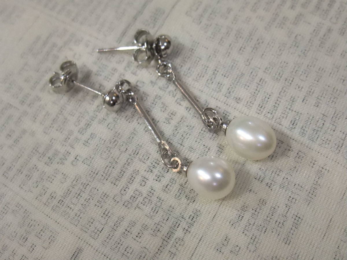 くっきりとした純白の美しい白真珠、テリツヤも大変美しい高品質の小粒~中粒のオーバル系(ややドロップのものも)のルースをシンプルな下がるタイプのピアスに仕立ててみました♪簡単な金具で、シンプルなバーのみのすっきりタイプですが、ちらちらと揺れるので、意外なほどに華やかでフェミニンです♪もちろん、そのままピアスとしての使用がお薦めですが、使われている淡水真珠ルースが高品質なので、バラしてお素材としてもお得感があります♪しっかりとしたヒートン付きなので、個自分の製作にもリメイクしやすい秀逸なお素材と思います♪金具のステンレスピアスパーツも、ごく普通のシンプルで簡単なタイプですが、ステンレスなのでとてもお手入れしやすく長く綺麗にお使いいただけます♪♪製作したものの残りで、手持ちにあるだけで終わりですので、もしお気に召しましたらこの機会に是非お求めください♪