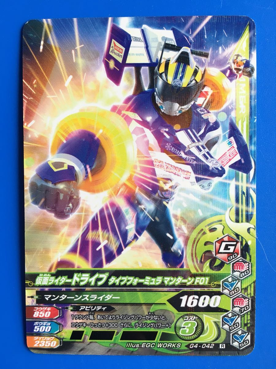 仮面ライダー、ガンバライジングの第G4弾から、No.042《仮面ライダードライブ・タイプフォーミュラマンターンF01》の登場です。発送は、普通郵便を利用します。(特にご希望のない場合)おとりまとめも可能ですが、送料に変動する場合がございます。また、送料のご請求は、自宅での計量を基準にご請求させていただいておりますので、実際の金額と差異が出る場合もございます。予めご了承ください。他にも多数出品中です。まとめてこの機会にいかがでしょうか?ご質問お待ちしております。