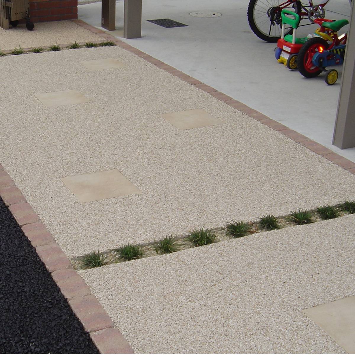 ※ 庭の雑草対策には、土の下地に砕石を50㎜厚程度で敷き固め、2~30㎜厚で、樹脂舗装します。