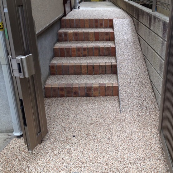 砕石敷きの犬走では、愛犬の足が、けがをしないよう、樹脂舗装にした事例もあります。