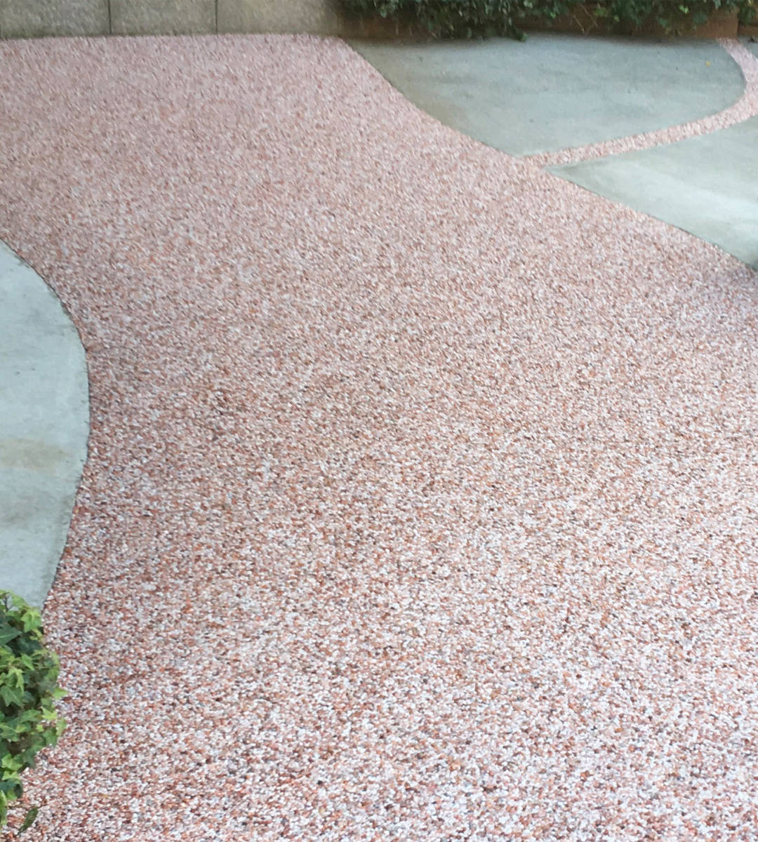 砕石敷きの犬走では、愛犬の足が、けがをしないよう、樹脂舗装にした事例もあります。