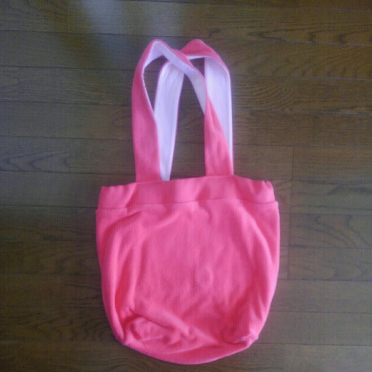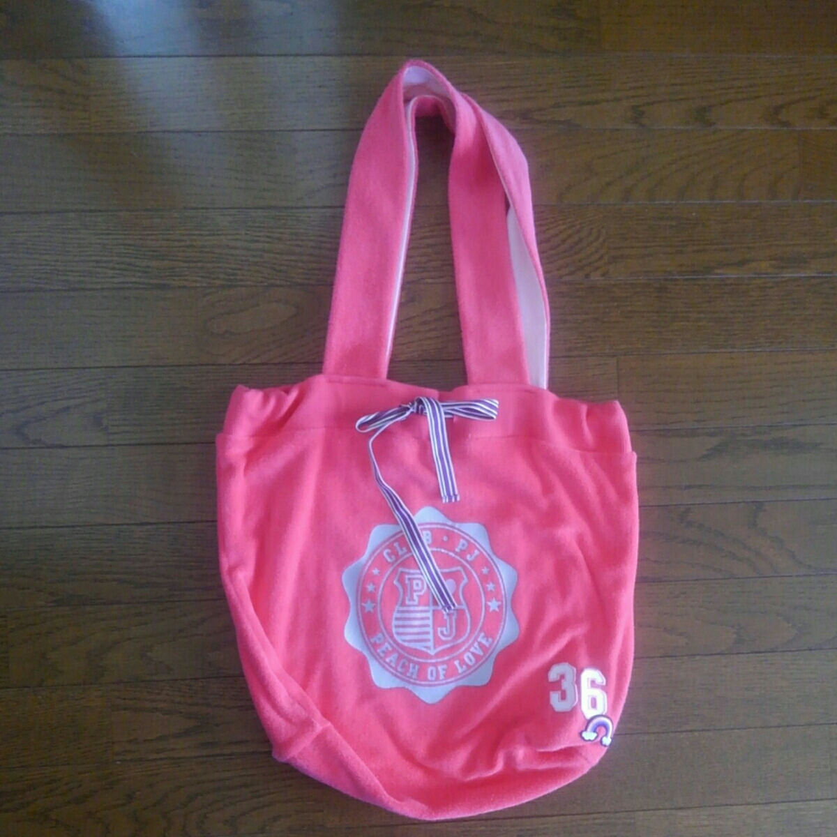 バッグの大きさは、縦約37cm、横約44cm、底の部分のマチ約13cm、持ち手の長さ約66cmです。裏地も、ついておりしっかりしています。