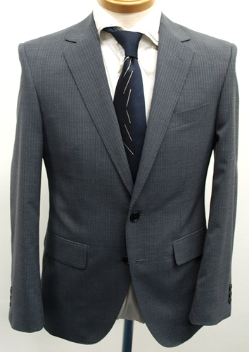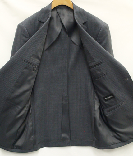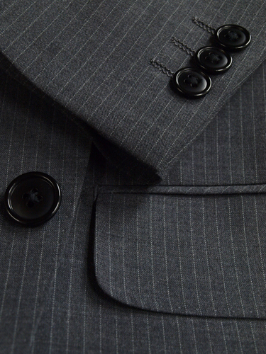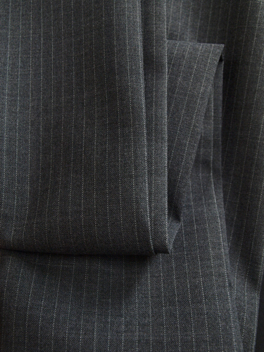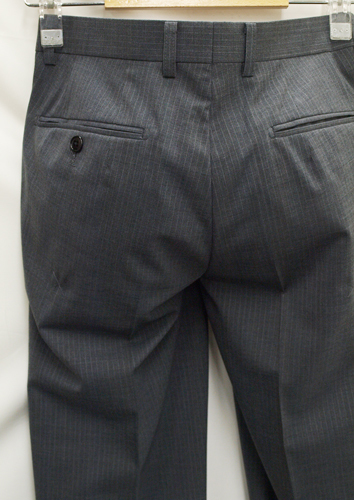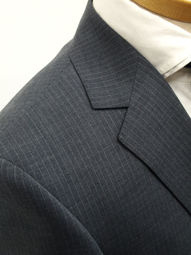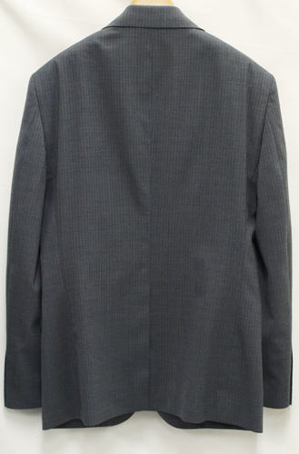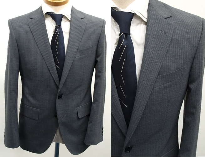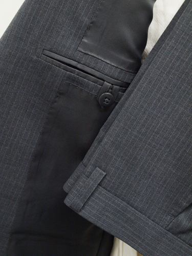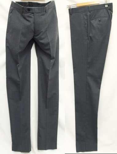 【サイズ】 A4 (AS号相当) 目安の体型 身長160cm~170cm、ウエストサイズ78cm前後 【ジャケット実寸】 肩幅44cm 着丈67.5cm 袖丈59cm 脇下部分48cm 身幅44cm 【パンツ実寸】 ウエスト(胴回り実寸)78cm (平置きでかるくはかると78cmでひっぱってはかると80cmです。股上が浅いため実寸が2cmほど大きめに作られております。) わたり幅31cm 股下10cm部分27.5cm 裾幅18cm 脇股上22cm 前股上24cm 股下89cm(裾上げしていない状態/新品) 【素材】 表地:ウール(毛)50% ポリエステル50% 裏地:胴裏/ポリエステル100% 袖裏/ポリエステル100% やや薄手の春夏向け紳士スーツ用ウールブレンド素材を使用 【色】 ミディアムグレー 【柄】 5mm間隔でオフホワイトのラインがはいったストライプ柄 【デザイン】 コンパクトな印象の細身ですっきりとしたシルエット、タイトフィットスリム、ビジネススーツ新品、裾上げしていない状態です。 ・ジャケットはシングル2つボタンでスリムモデル ・パンツの股上は浅く細いシルエットのノータックスリムテーパードパンツ 春先~夏~秋口にかけて春夏メインのシーズン対応商品 【縫製仕様】 ・ジャケットはシングル2つボタン、ノッチドラペル、襟元等AMFステッチ入り、袖口ボタン3つ、センターベント、内ポケット4つ(小ポケット2つ含む)、背抜き(春夏物) ・パンツはノータック、膝裏当て付き、脇ポケット斜め付け、後ろポケット左のみボタン付き、フロントはファスナーでボタン&ホック仕様/うちかけボタンあり 細部まできちんとしたビジネススーツの縫製仕立てになっております。