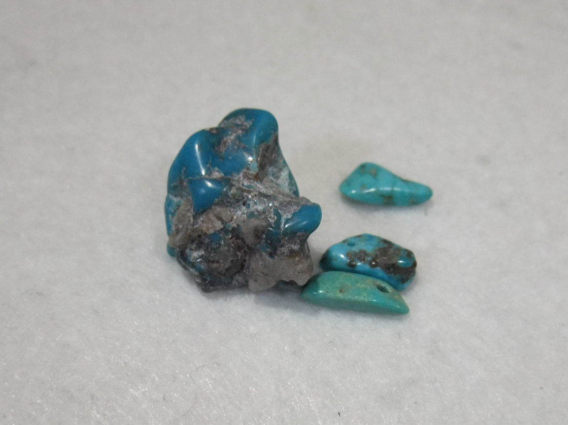 古い購入のお品の製作残りになりますが、状態のまずまずよい、本ターコイズのナゲットルースと、小粒で使いやすいクレオパトラな穴開けの小粒~中粒タイプ、昔の古いルースで、ややキズや欠けワレ(B品難ありのパーツも混じります。画像にて良く吟味してください)は見受けられますが、ハウライトやアグネサイトではなく、間違いなく本物の本ターコイズです。一番大きいものはアメリカのブランド鉱山もののはずですが、タグなどが残っていなくはっきりとしないのでお安くお出しします♪詳しい方は鉱山を色々と推測できて二倍に楽しめるかと♪以前に製作をしたものの残りを雑多にまとめて保管してあったものなので、おおよそアメリカものが多いとは思いますが、敢えて全品産地不詳でお安く♪この価格なら惜しげなく銀細工や真鍮細工などアクセサリー製作に使用していただけます♪♪