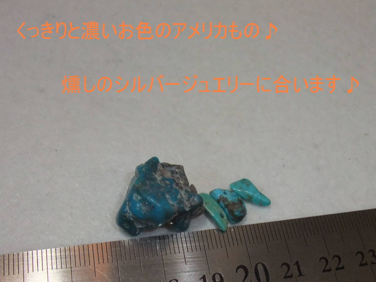 メインの大きいのは、高価なソリッド系のものではないですが、酸化ゲーサイトの黒っぽいウェブや水晶基質の混じりなどがラフでかっこいい、本ターコイズのナゲットルースです。インクルージョンが強すぎてカボッションとかには仕上げられなかったらしいややコロフォーム系のルースですが、かえって最近のシルバー系の製作にはこのラフさがかっこよく決まると思います♪