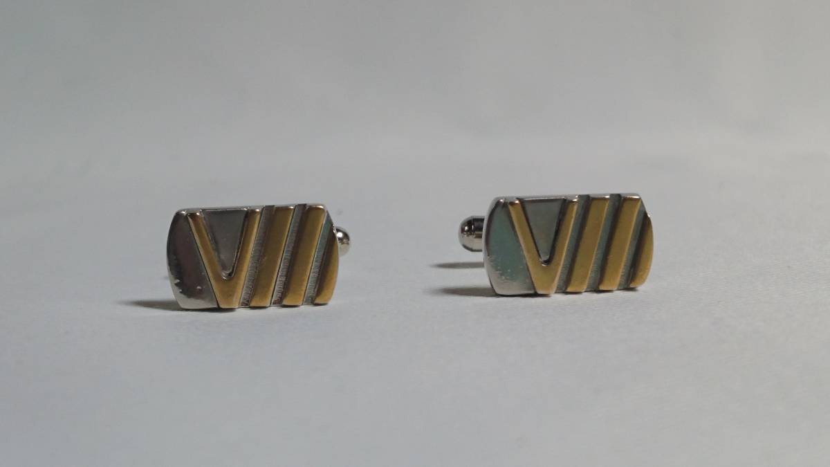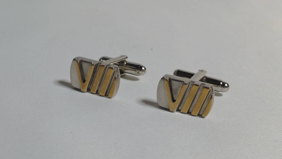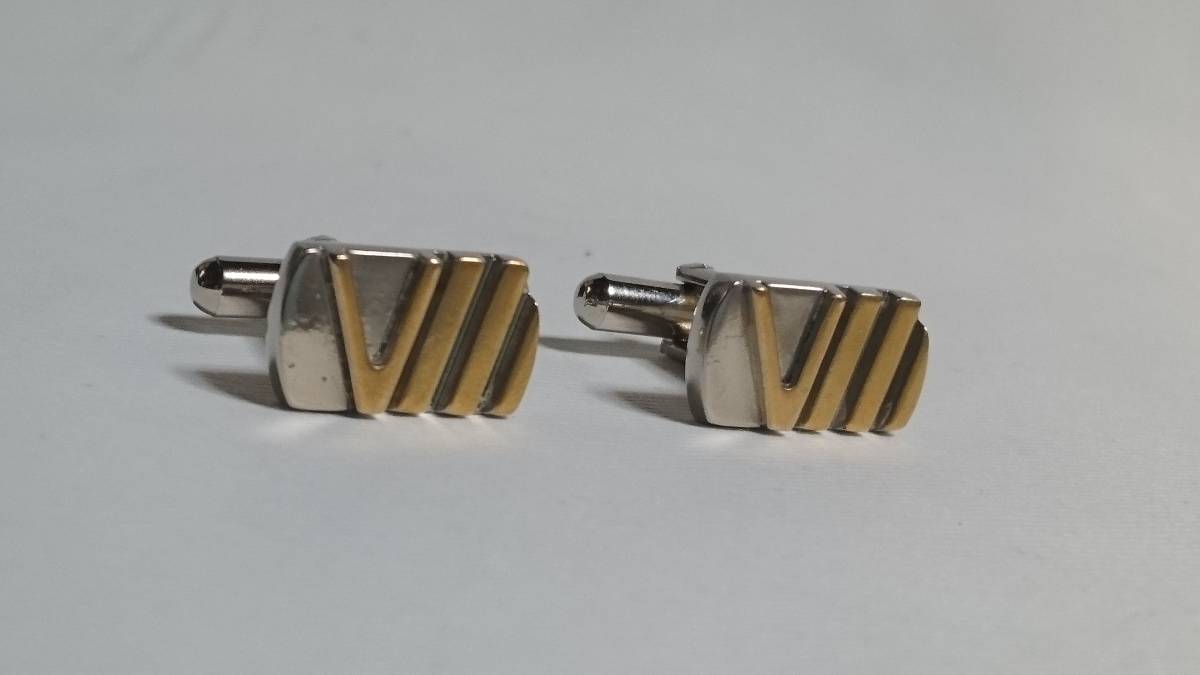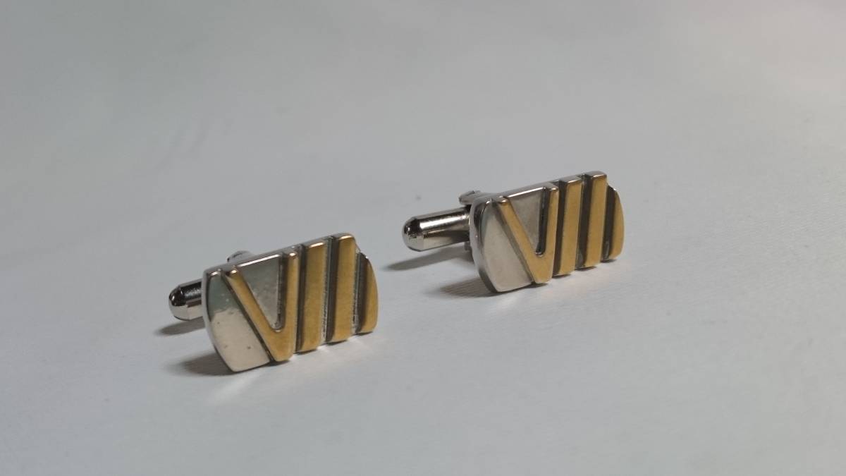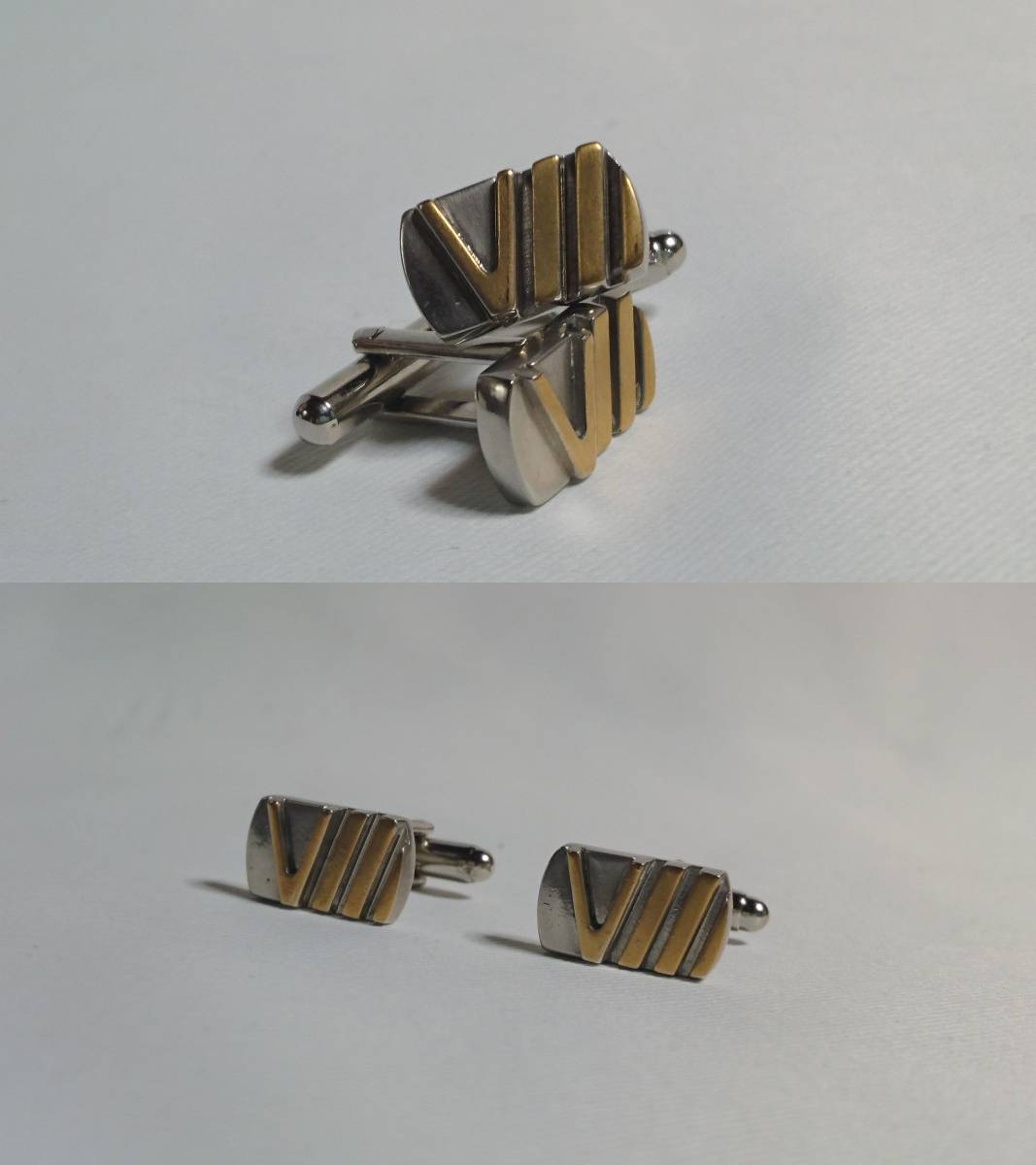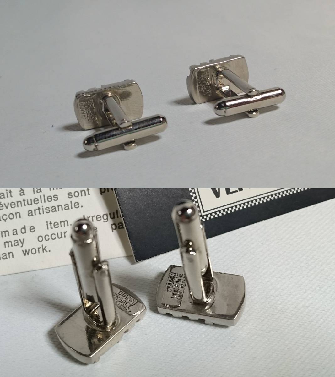 正規美 激レア ヴェルサーチVERSACE 立体Vロゴスクエアカフス 金×銀 ヴィンテージカフリンクス スクエアボタン×ゴシック×グレカライン★