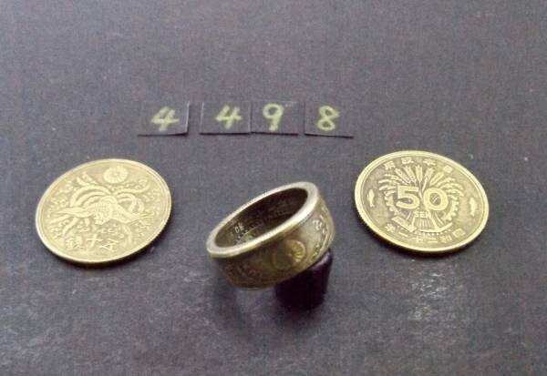 この商品は、昭和21年発行の 大型50銭黄銅貨を使用し、貨幣に穴を明け木槌で叩いてリングに成形した1点ものです。