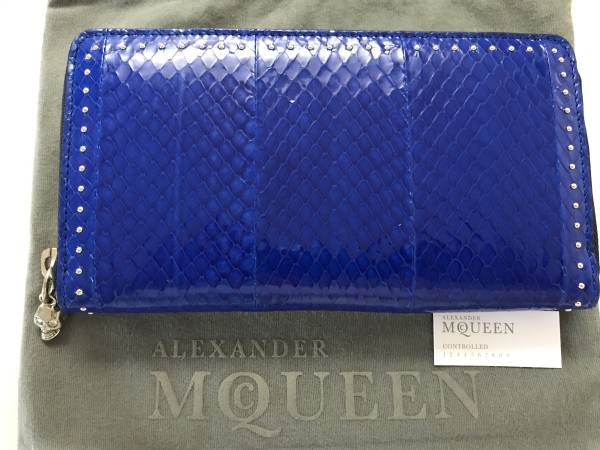 新品 ロサンゼルスのAlexander McQeenのショップで購入しました。カラーは綺麗なブルーです。カーフレザー製 型押しです。両側にスタッズがあります。ジップはスカルがついています。サイズは横19.5cm高さ10.5cm 奥行き2.5cmです。カード入れ12 ポケット2 札入れ2 ジップ付きポケット1 購入価格は10万円ほど(税込み)でした。 商品番号は 806981172です。