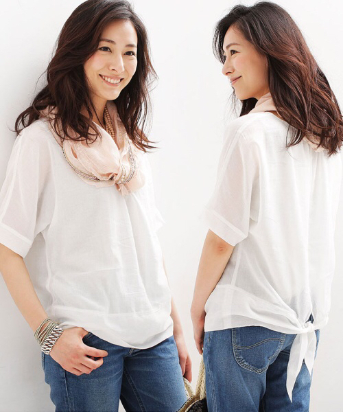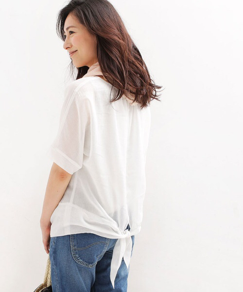 ◆インナーにグレーのタンクトップ付(縫い付けの一体型)♪薄いガーゼの様な質感でシワ加工デザイン♪バック側の結ぶデザインが可愛いトップス