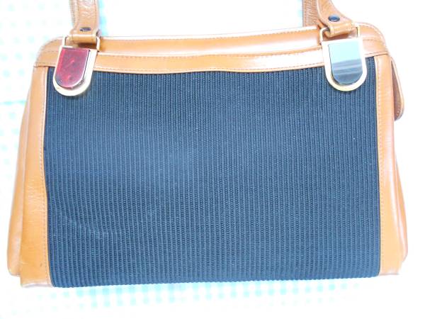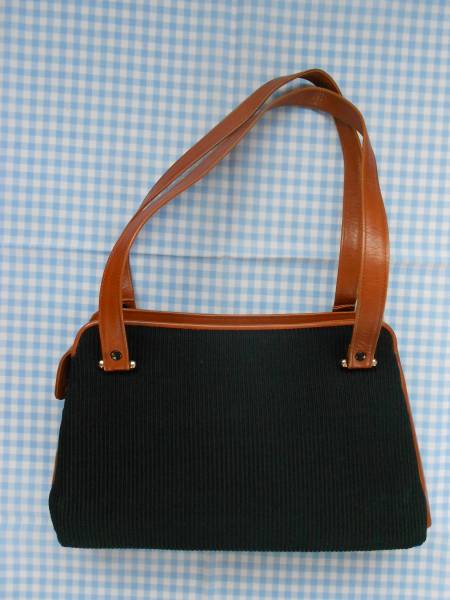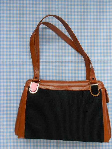 黒い筋状の布と茶色の合皮のツートンカラーでできたショルダーバッグです。大きさは横32×縦21×マチ7、持ち手の長さ66です。中には貼ポケットとファースナー付きポケット、脇には強力ボタン付きの狭い小物入れが付いています。とってベルトに付いている飾りボタンの色が違っています。送料は定形外(簡易包装で)ギリギリ660円可能です。゜