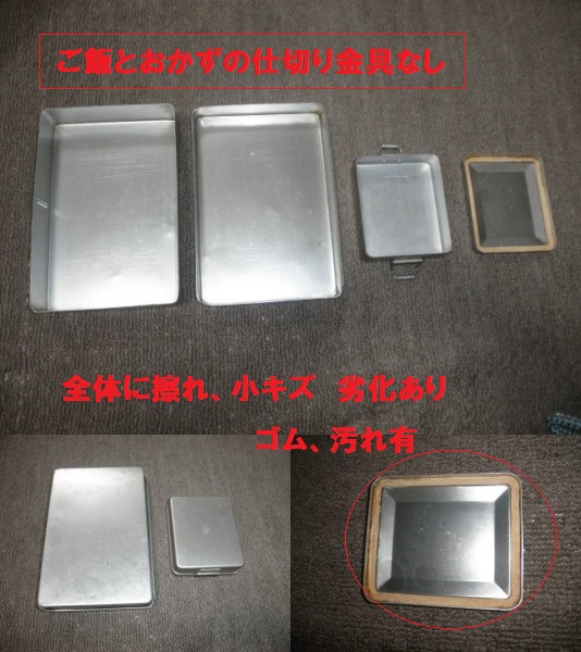 | 昭和レトロ品のアルミ弁当とおかず入れです。 懐かしのアルミ弁当です。 画像で表示のように 側面部の箸入れケースがついておりません ご飯とおかずの仕切り金具がついておりません。 側面部ペン先で突いたような凹みありまたおかず入れの白いラバーに汚れが見られます。 全体に時代のキズ 擦れ、アルミの劣化痕等ございます。ご理解ください。 ☆ ホクセイ 特大の刻印が見られます。 サイズ お弁当 横14.4cm 縦21cm 厚み3.8cm おかず入れ 横9.6cm 縦11.4cm厚み3.2cm 送料 補償なし定形外円可 ーーーーーーーーーーーーーーーーーーーーーーーーーーーーーーーーーーーーーーーーー 神経質なお方・些細な事が気になるお方、 または、新品をお求めのお方は、ご入札をお控えください。 ♪出品時、十分確認はいたしておりますが、稀にキズなど見落し がある場合がございます。中古品をご理解の上、ノークレームノーリターンでお願いいたします。 ―――――――――――――――――――――――――――――――――― 画像に写しきれないキズや見落とし等あるかもしれませんが、ご理解の上ご入札をお願いします。 アンティークの為、お客様との見解の相違が多少あるかと思いますがご理解の上、ご入札よろしくお願い致します。 | |||