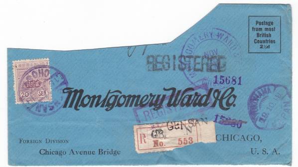 田沢旧大正毛紙20銭貼外信書留書状 アメリカ宛