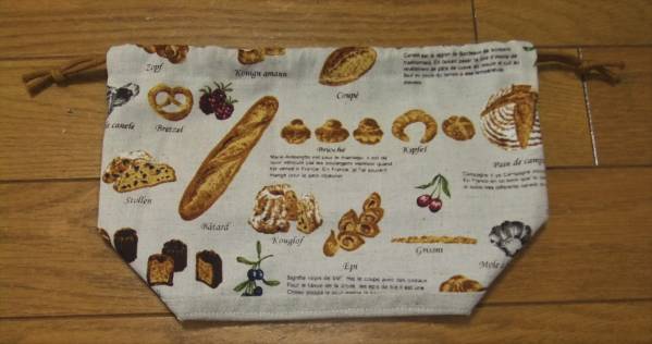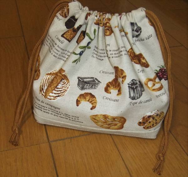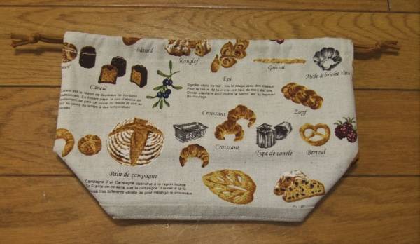 たくさんのパンの絵柄が入ったプリント生地と、綿麻の無地生地を組み合わせてお弁当袋を作りました。無地生地はちょうど底部分になります。