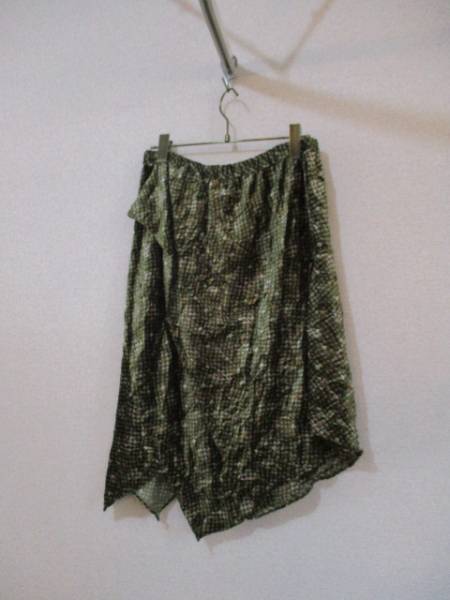 商品紹介 | 幾何学模様がプリントされたミモレ丈スカートです。 裾は長さが違う形で、表にもう一枚生地が重なっています。 地色はカーキ、プリント部分はオレンジっぽい茶と白等です。 素材はベロアで、シワ加工が施されています。 《素材》 ポリエステル100% |