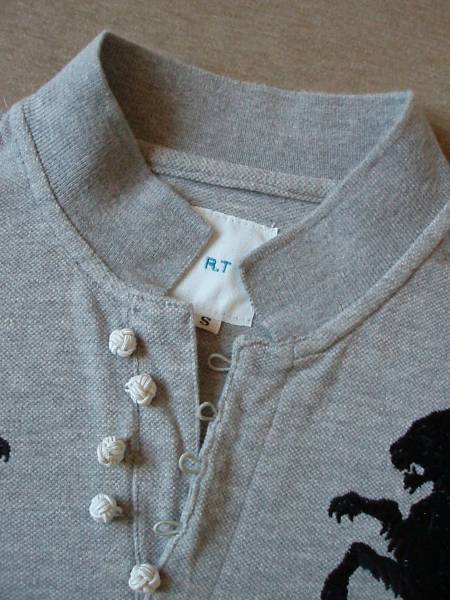 beyesの表参道フラッグショップで購入したR.T(designed by Ramdane Touhami)のポロシャツです。素材はコットン100%です。スタイルはシンプルでありつつ、前身頃にはブラックの刺繍によるデザイン、前ボタンは組み紐仕上げというR.Tらしい一着です(画像参照)。胸ポケットはなくベーシックなカラー・デザインなのでジャケットやボトムスを選びません。スタンドカラーと袖先はリブ仕上げ、両脇には約4cmのスリットがあるため着用時シャープなシルエットがつくり出されます(画像参照)。出品商品は数シーズン前のコレクションなので現在では入手困難だと思います。実際yahoo!オークションをはじめ、他のオークションでも目にしたことがありません。R.Tでこのデザインを探されている方にオススメしたい商品です。着用後は手洗い対応するなど丁寧に対応したため、スレ、傷等は確認できませんが、自宅保管による劣化は見受けられます。商品状態は画像にてご確認ください。また、劣化など踏まえた上で現価格に設定していることをご理解の上、ご入札ください。【サイズ】S 身幅47.5㎝、着丈61㎝、肩幅40㎝、袖丈22.5㎝)いずれも概寸なので多少の差はご了承ください。よろしくお願いします。