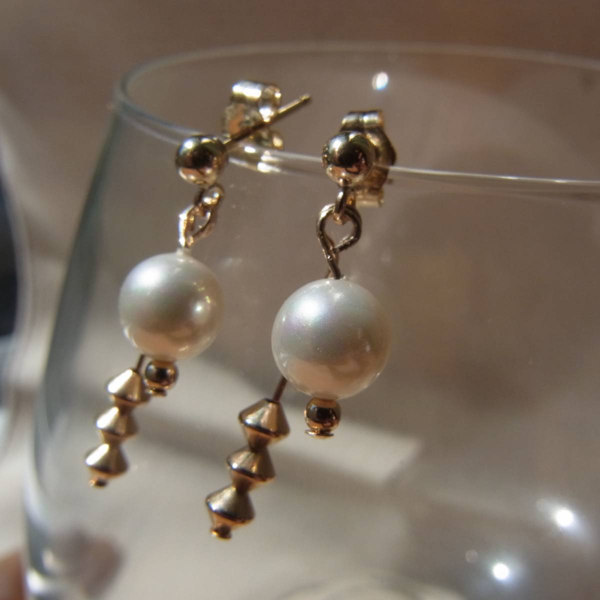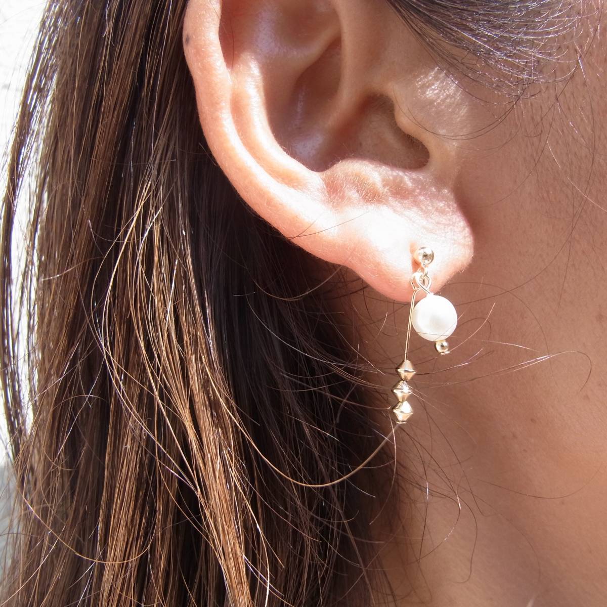 ゴールドがベースの大人ピアス。パールの後ろにはもう一つゴールドビーズがついたチャームがかかっていて華やかさを演出
