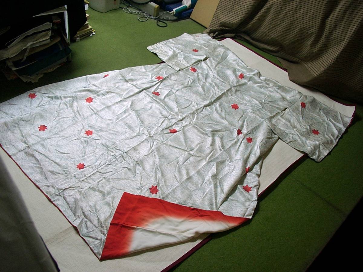 □ | 正絹。 仕付糸が付いています。 淡い白郡色の暈し地に芝草、楓模様が表されています。 気になる汚れはございません。 着用にお勧めします。 |