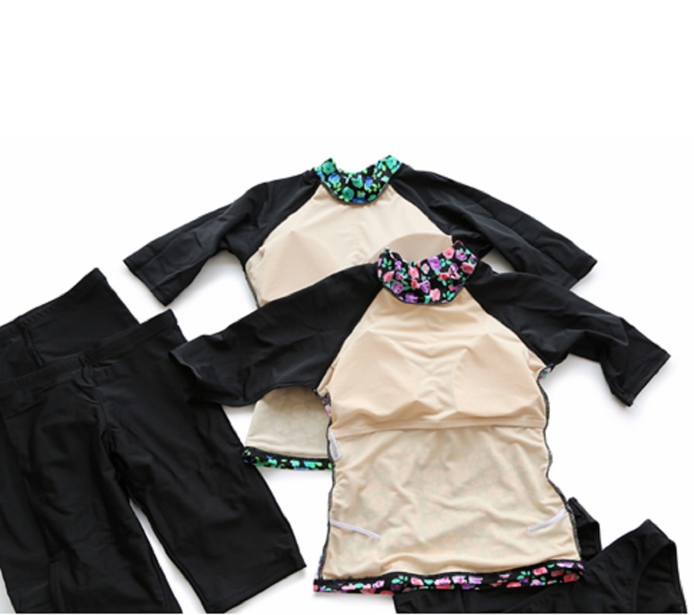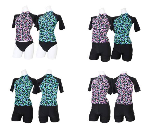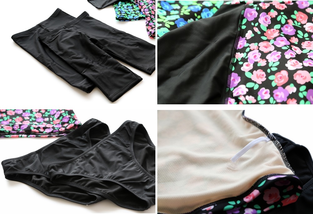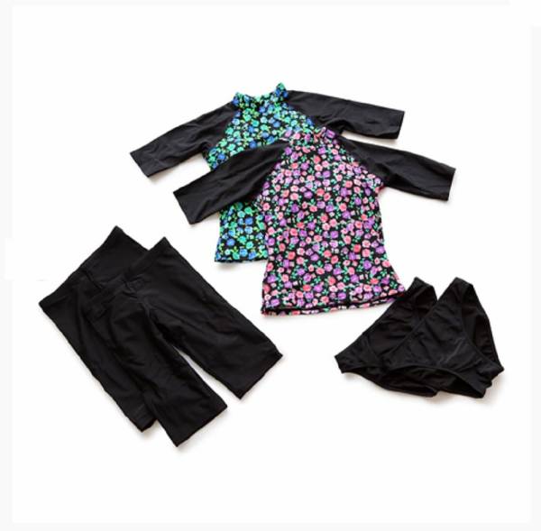 • 着脱しやすい上下が分かれたセパレーツスタイルの3点セット。半袖トップスと5分丈ハイウエストパンツ、ビキニパンツで気になる体型もカバーします。