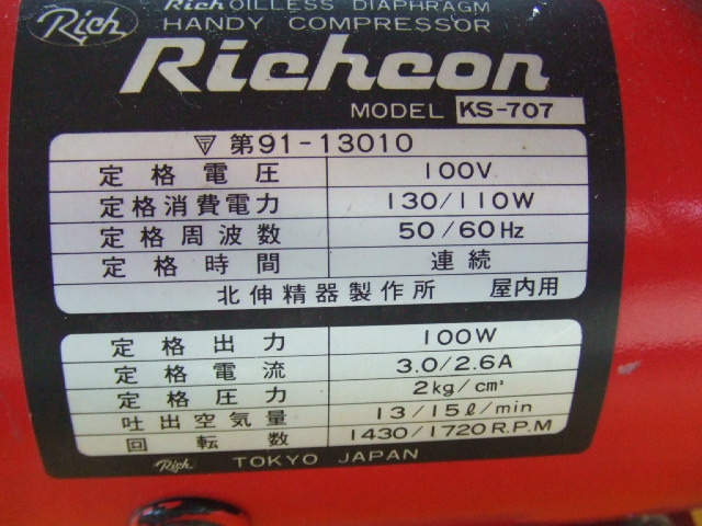 エアコンプレッサー Richcon KS-707 エアーブラシ、ホース付 作動確認済の中古です。3Nにて宜しくお願い致します。